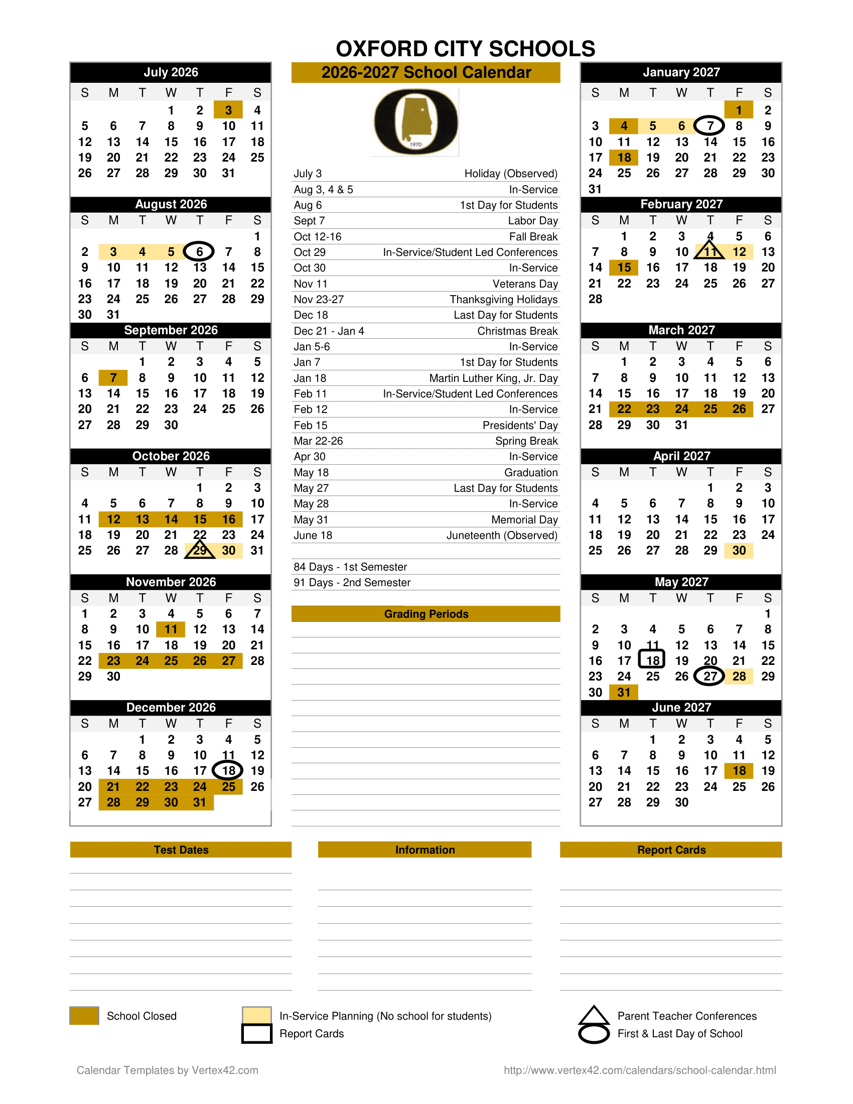Dates are sourced from the official Oxford City Schools AL Calendar 26-27 Revised [PDF] website. Dates may change at the discretion of the district. Always verify with the official school website for the latest updates.