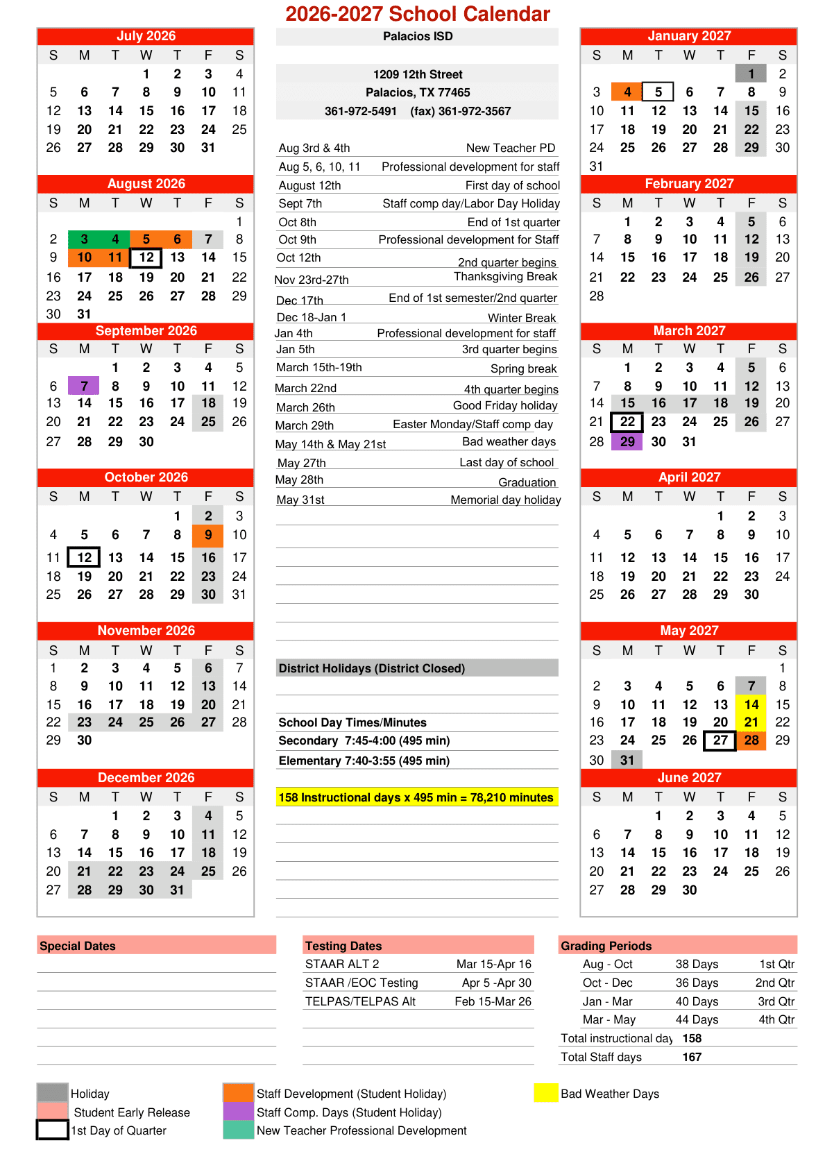 Dates are sourced from the official Palacios ISD 26-27 Calendar Revised [PDF] website. Dates may change at the discretion of the district. Always verify with the official school website for the latest updates.