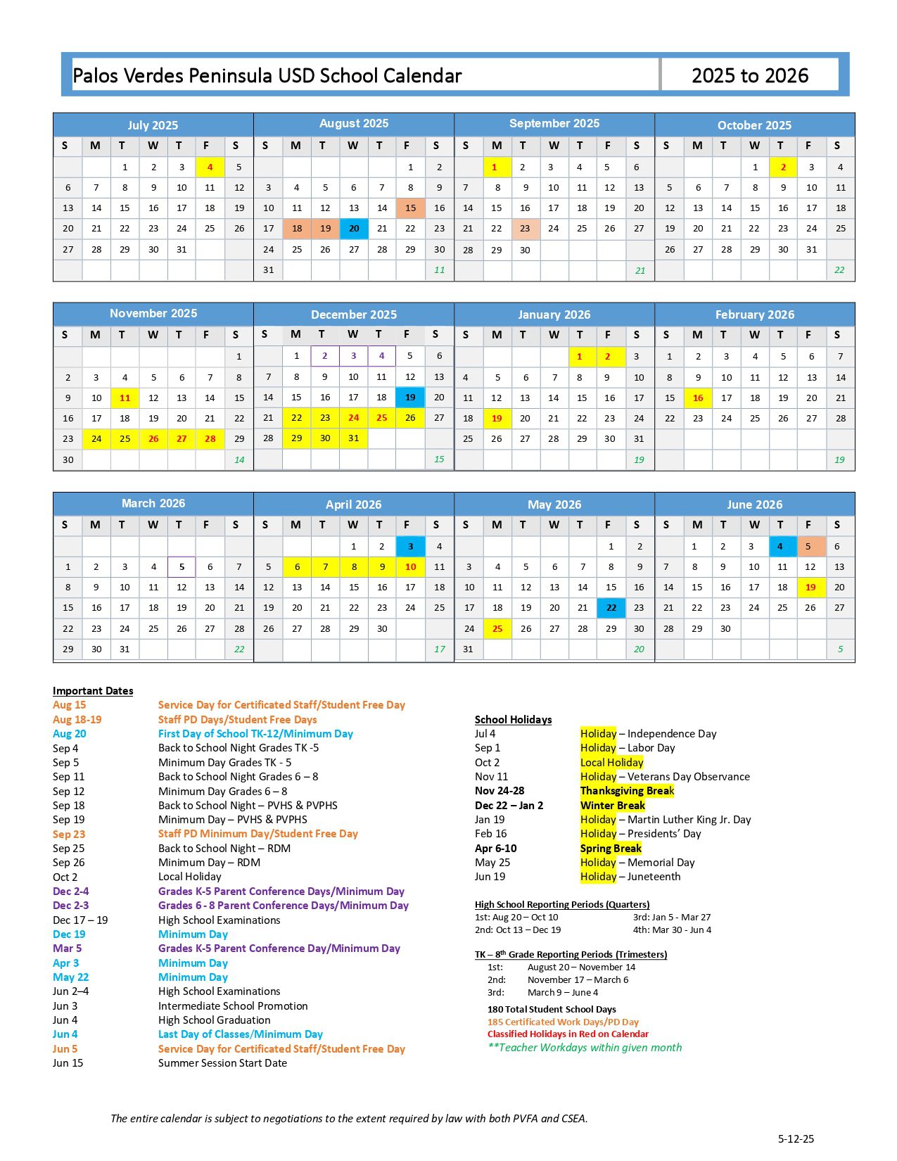 Palos Verdes Peninsula USD School Calendar Calendar (2025-2026)