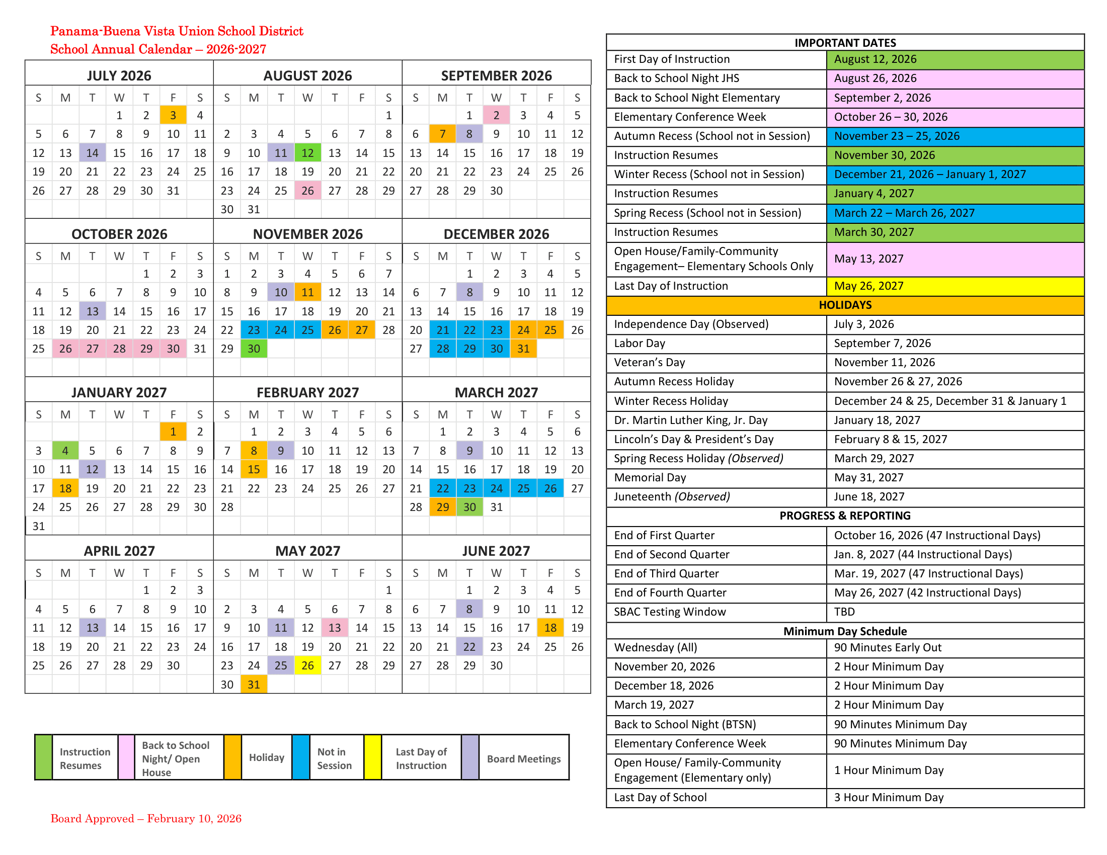 Panama-Buena Vista Union School District Calendar (2026-2027)