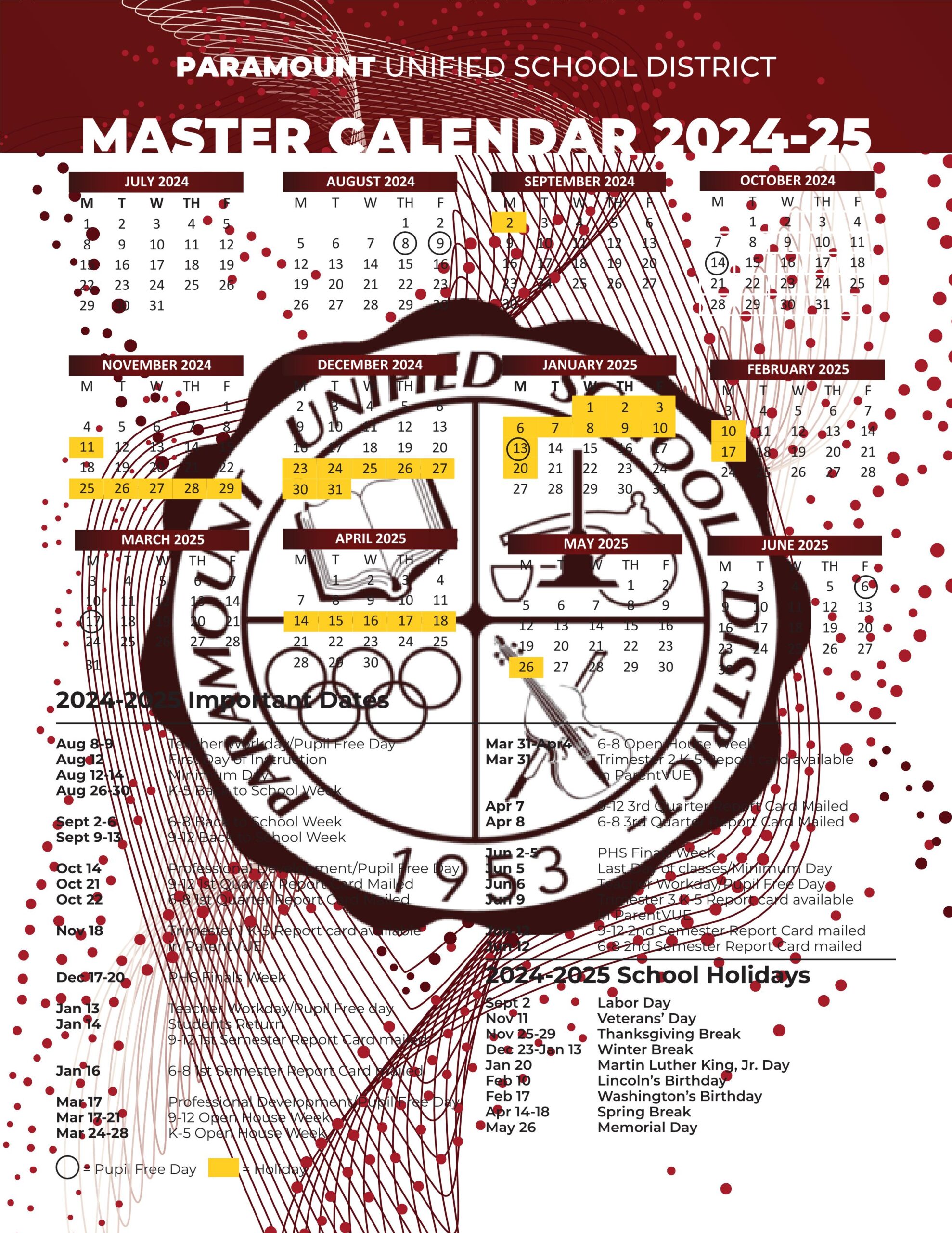 The school calendar provided on this page is taken from the official PUSD Paramount Unified School District website. Please note that all dates and events are subject to change at the discretion of the school district. For the most accurate and updated information, please refer to the official district website or contact the school helpline.