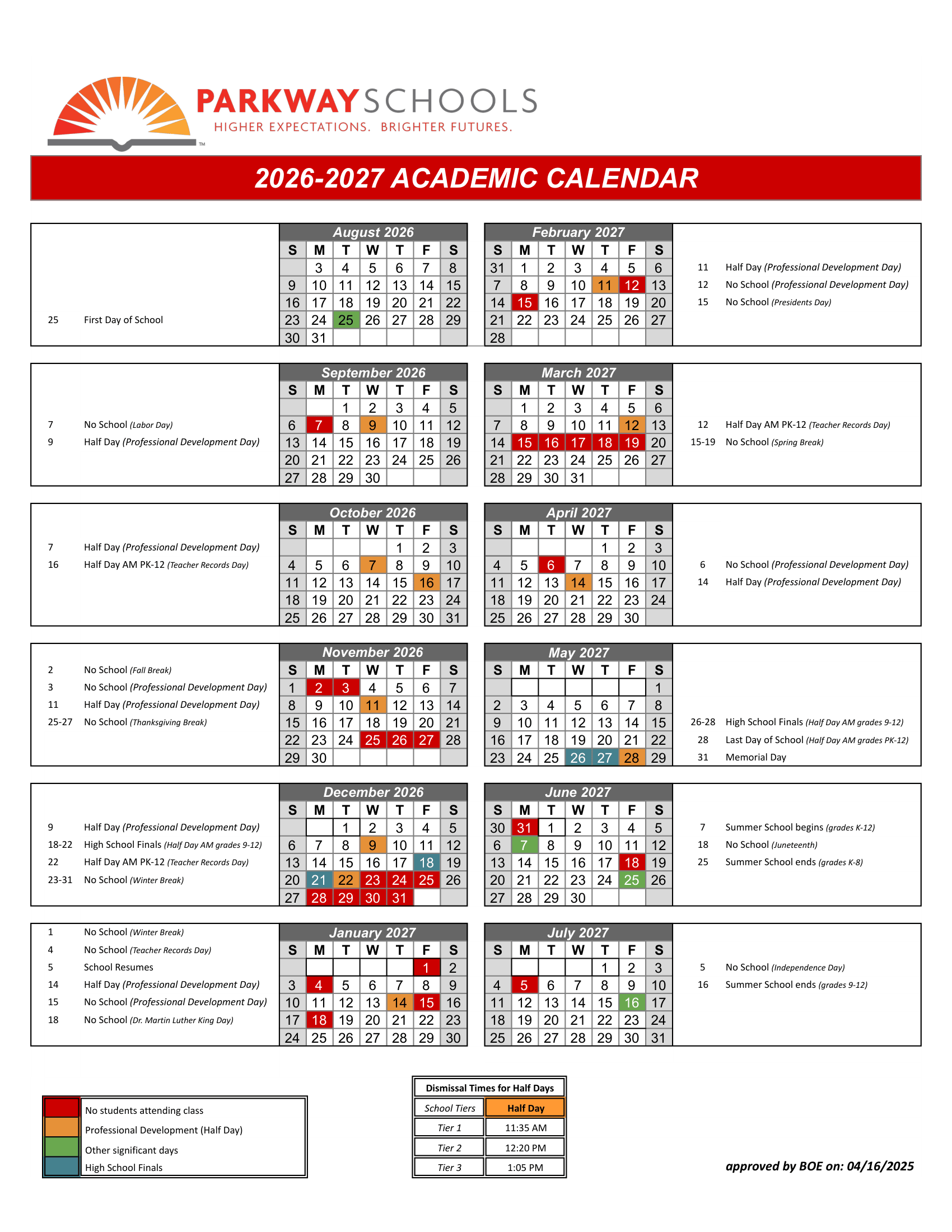 Dates are sourced from the official Parkway Schools 26-27 Calendar Revised [pdf] website. Dates may change at the discretion of the district. Always verify with the official school website for the latest updates.