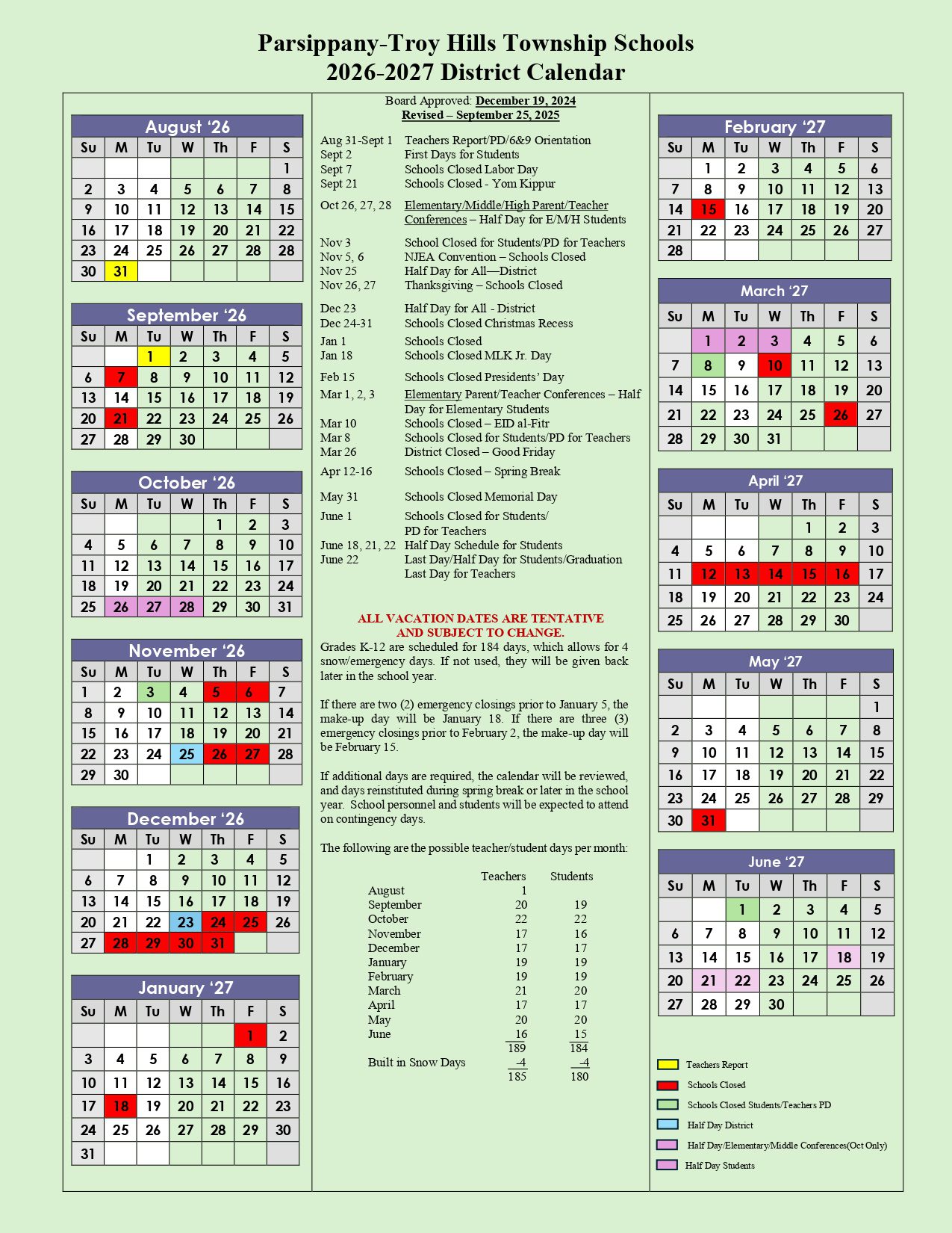 Dates are sourced from the official Parsippany-Troy Hills Township 26-27 Calendar [PDF] website. Dates may change at the discretion of the district. Always verify with the official school website for the latest updates.