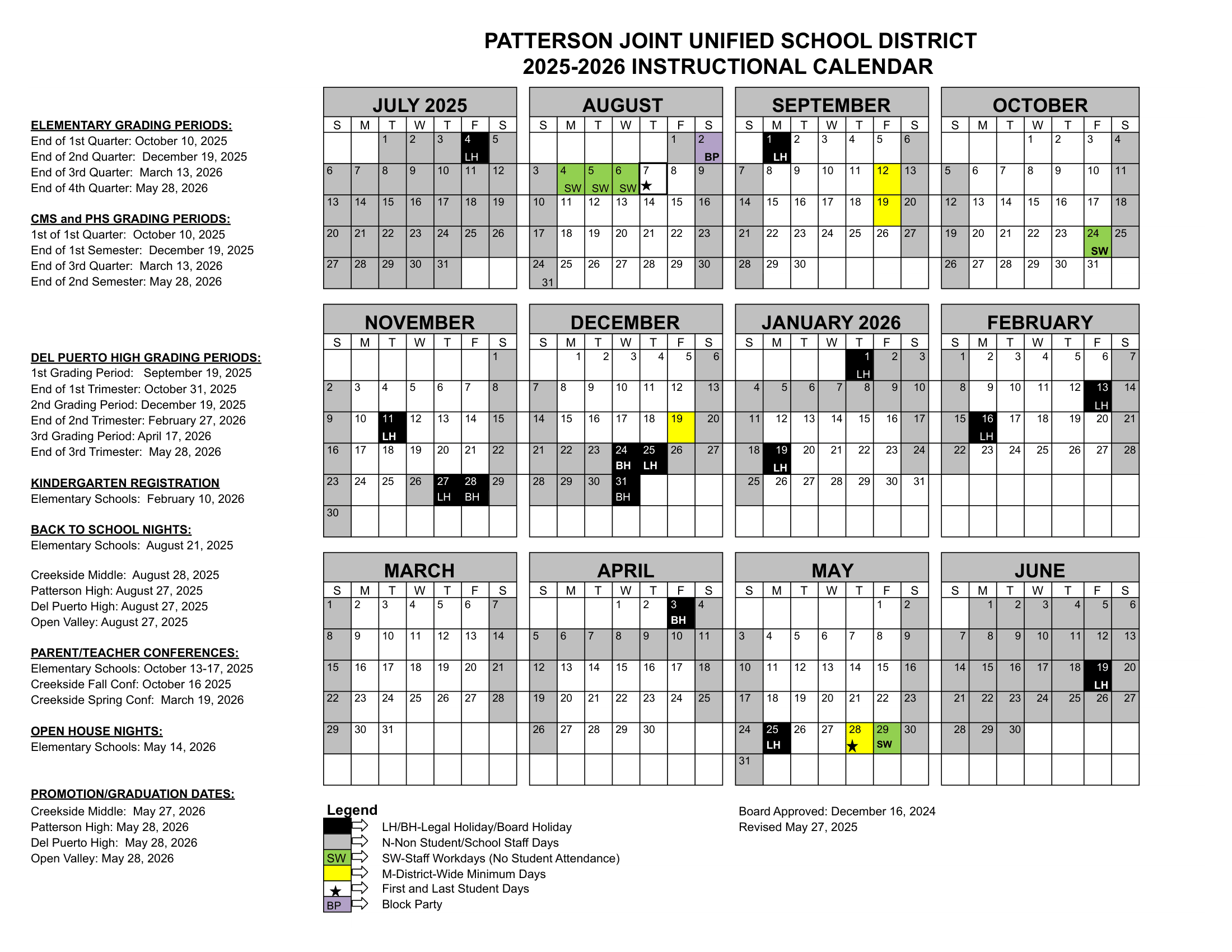 Dates are sourced from the official Patterson Joint Unified School District USD 26-27 Calendar [PDF] website. Dates may change at the discretion of the district. Always verify with the official school website for the latest updates.