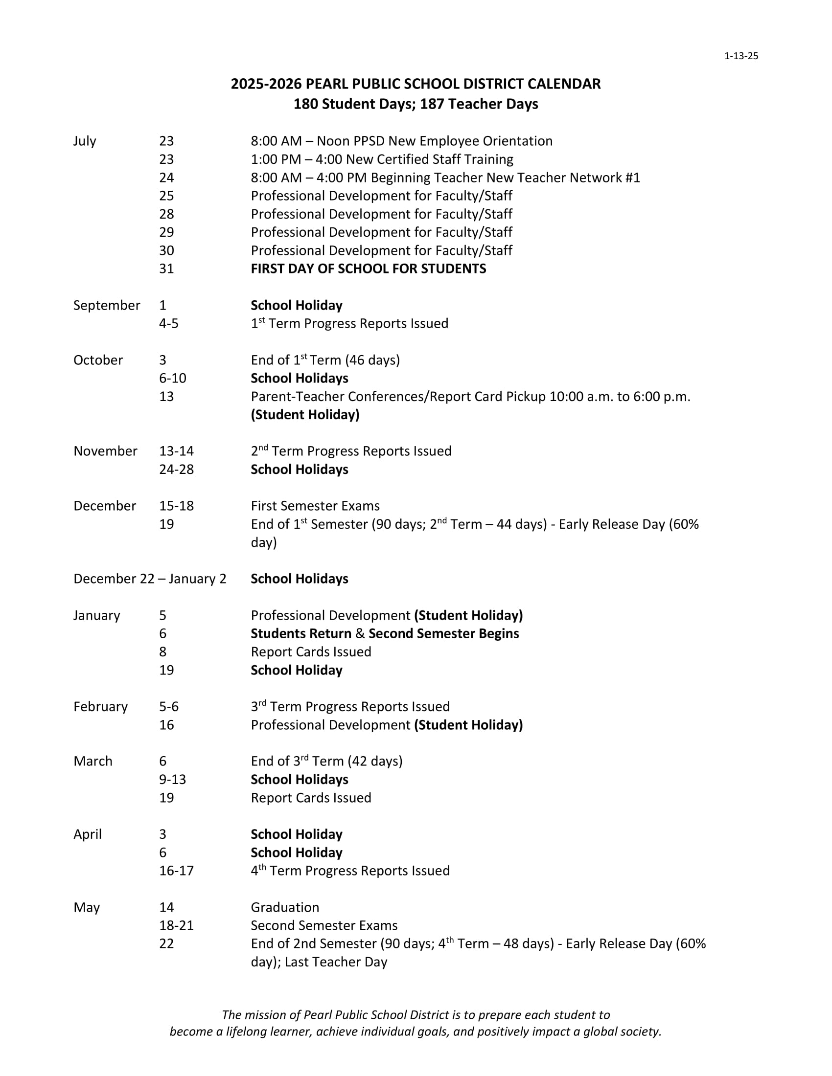 Pearl Public School District Calendar 25-26 Revised [pdf]