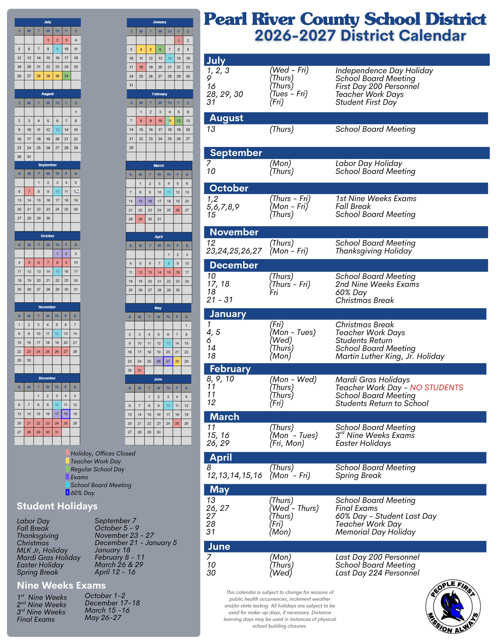 Dates are sourced from the official Pearl River County School District ms 26-27 Calendar UPDATED [PDF] website. Dates may change at the discretion of the district. Always verify with the official school website for the latest updates.
