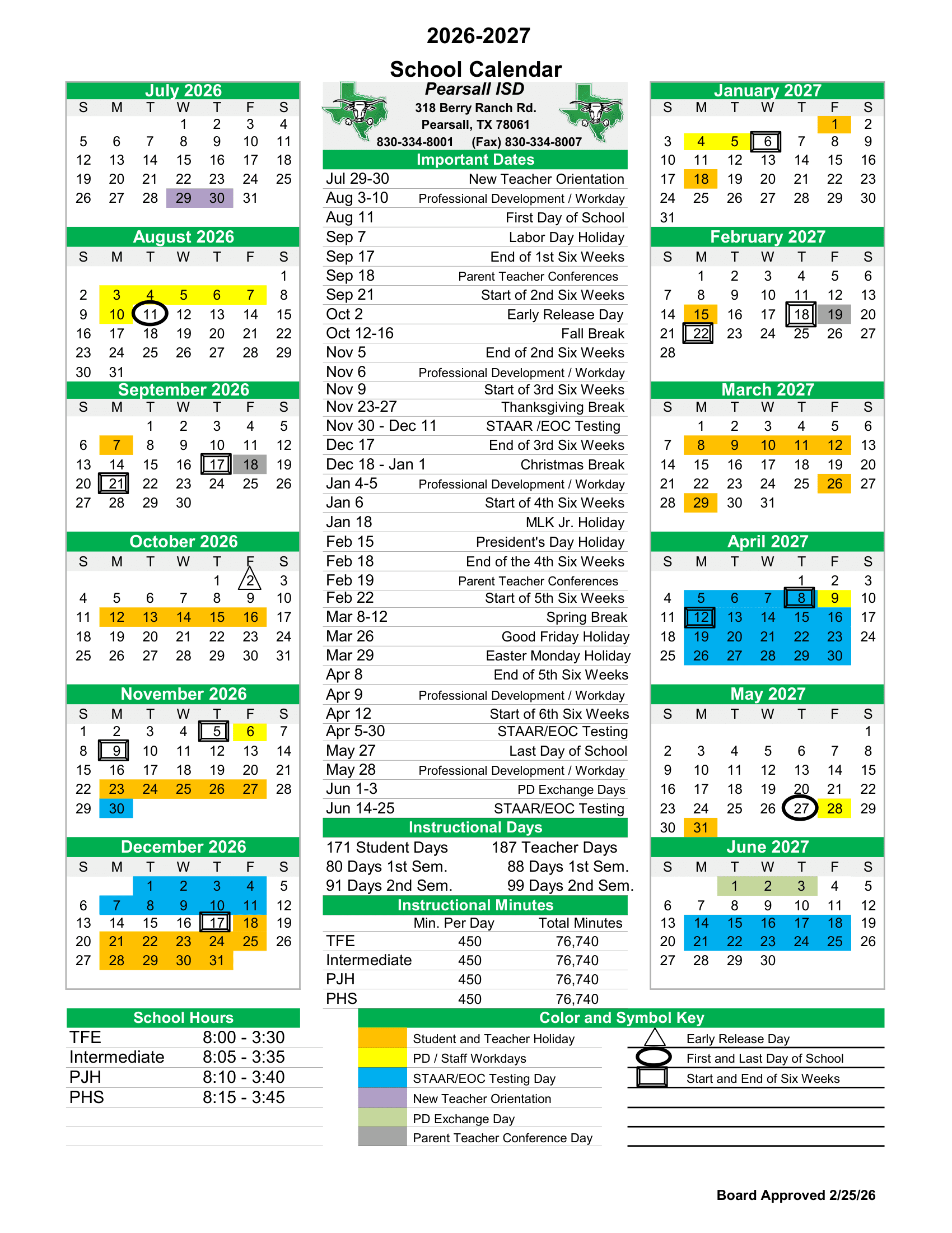 Dates are sourced from the official Pearsall ISD School Calendar 26-27 Revised[PDF] website. Dates may change at the discretion of the district. Always verify with the official school website for the latest updates.
