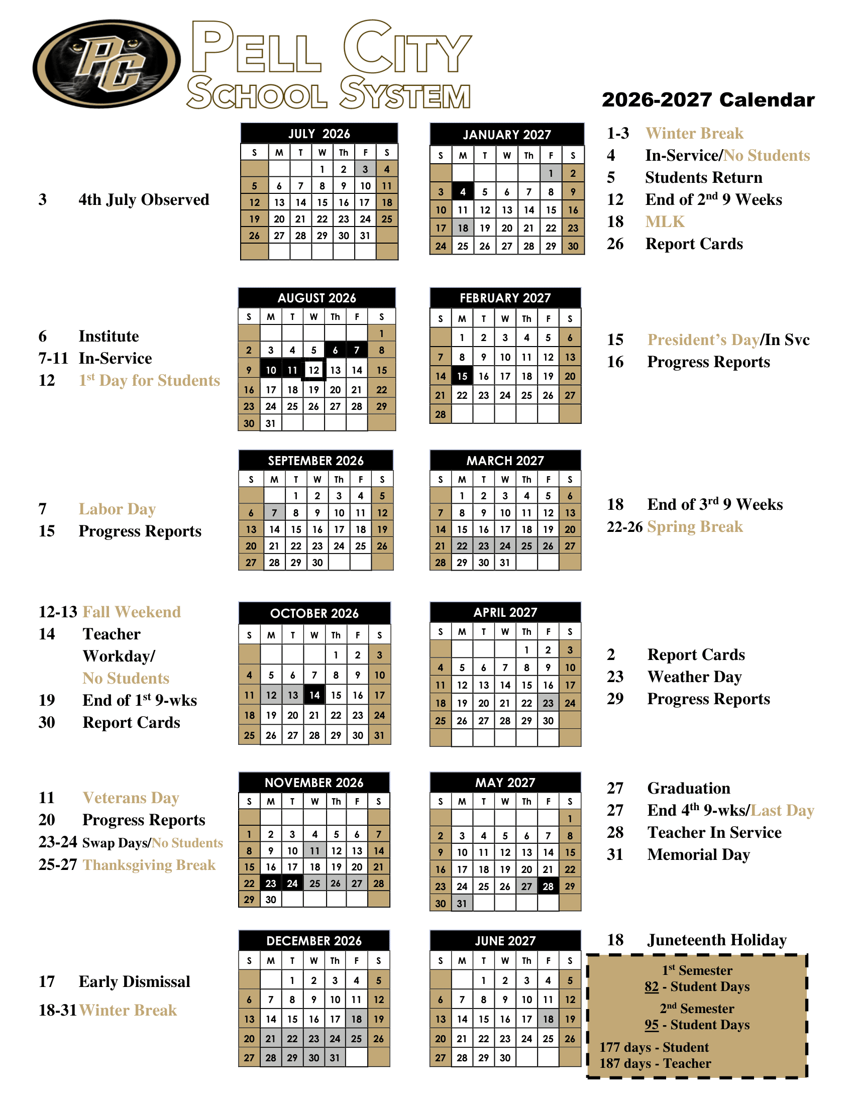 Dates are sourced from the official Pell City School System AL Calendar 26-27 Revised [PDF] website. Dates may change at the discretion of the district. Always verify with the official school website for the latest updates.
