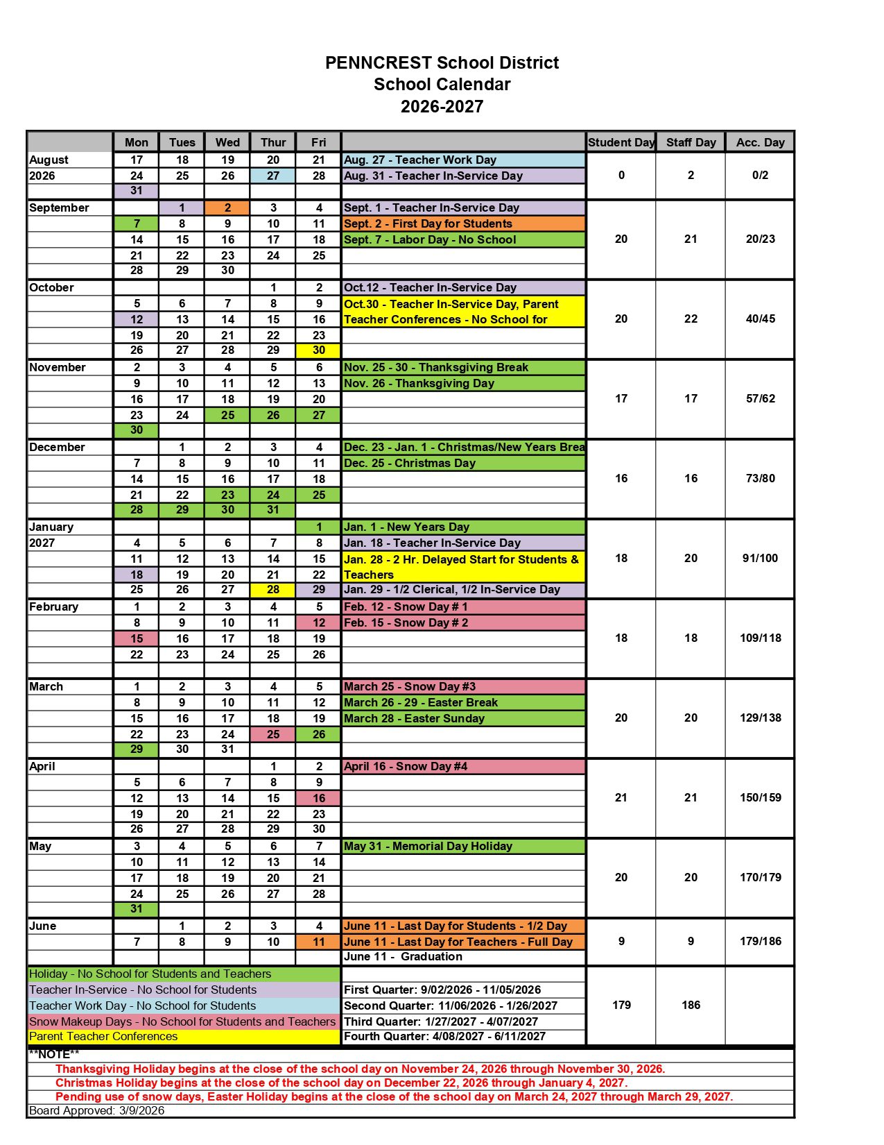 The Printable school calendar provided on this page is taken from the official PENNCREST School District PA Calendar 26-27 Updates. Please note that all dates and events are subject to change at the discretion of the school district. For the most accurate and updated information, please refer to the official district website or contact the school helpline.