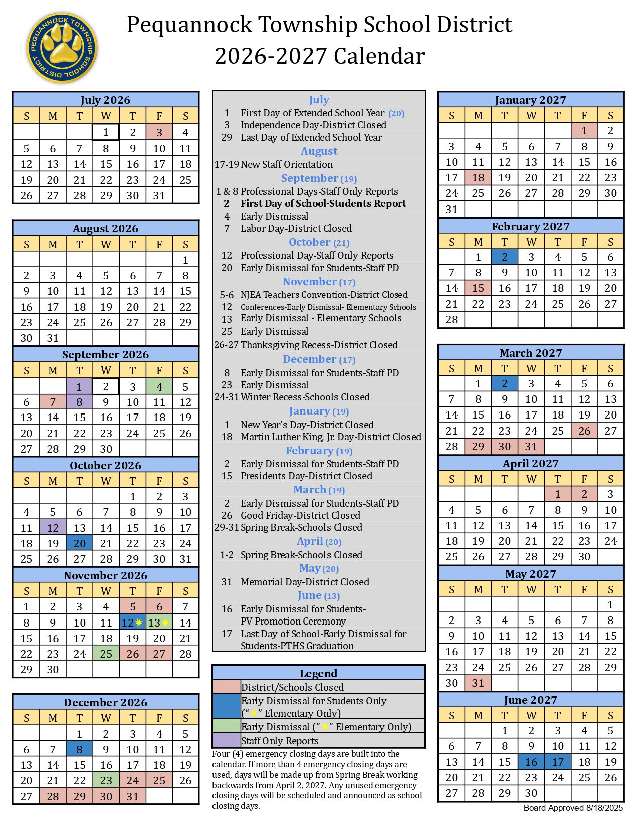 Pequannock Township School District Calendar (2026-2027)