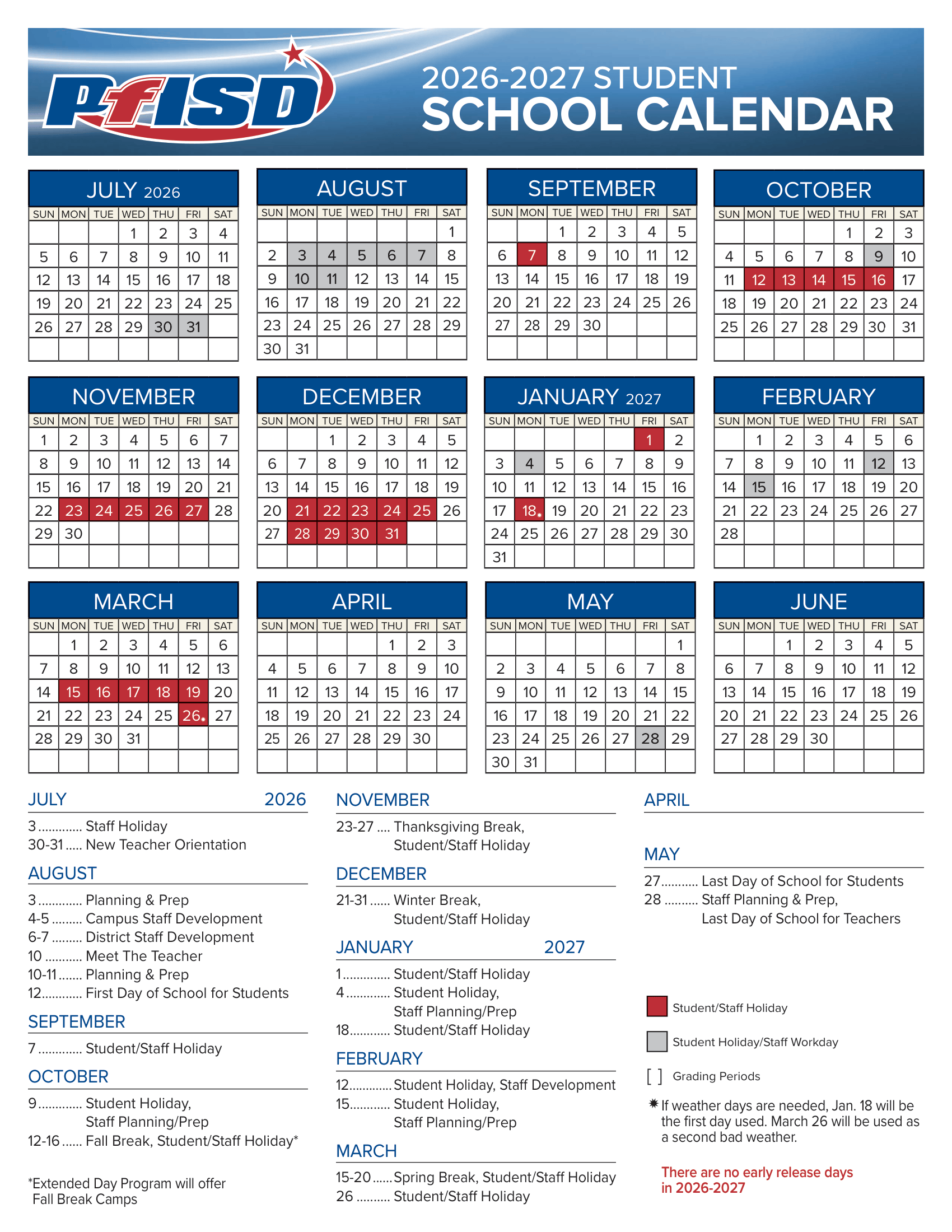Dates are sourced from the official Pflugerville ISD Calendar 26-27 Calendars [PDF] website. Dates may change at the discretion of the district. Always verify with the official school website for the latest updates.