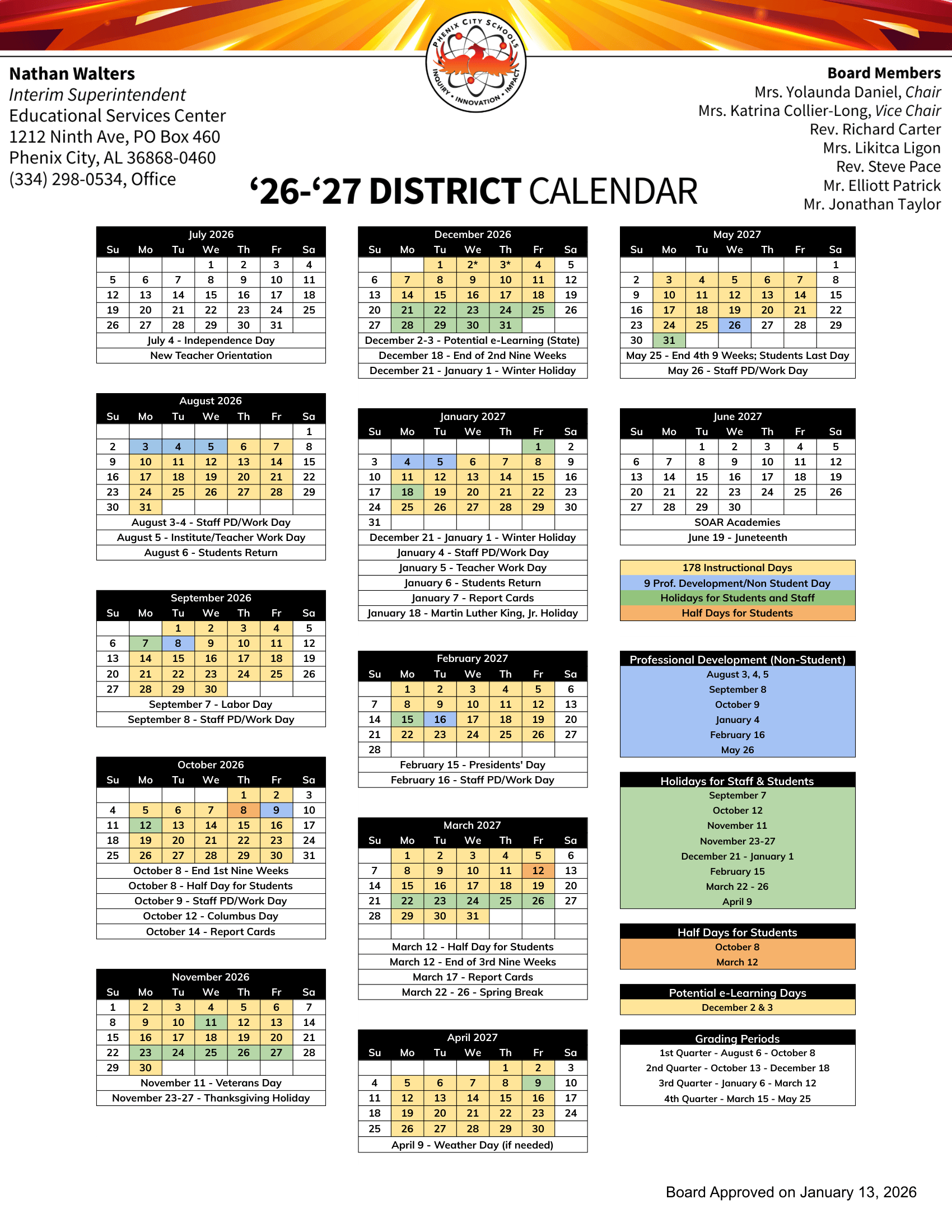 Dates are sourced from the official Phenix City Schools AL 26-27 Revised [PDF] website. Dates may change at the discretion of the district. Always verify with the official school website for the latest updates.