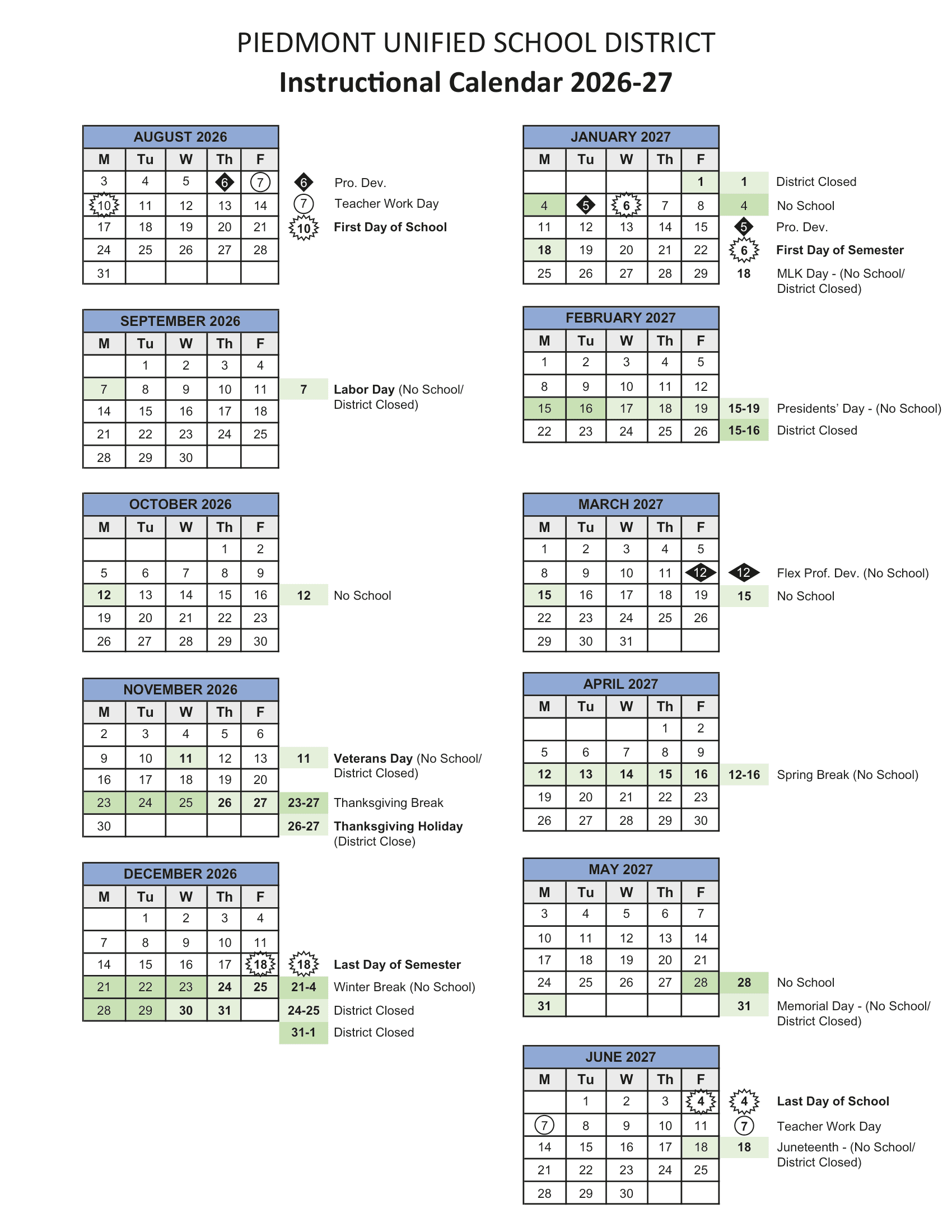 Dates are sourced from the official Piedmont Unified School District USD 26-27 Calendar[PDF] website. Dates may change at the discretion of the district. Always verify with the official school website for the latest updates.