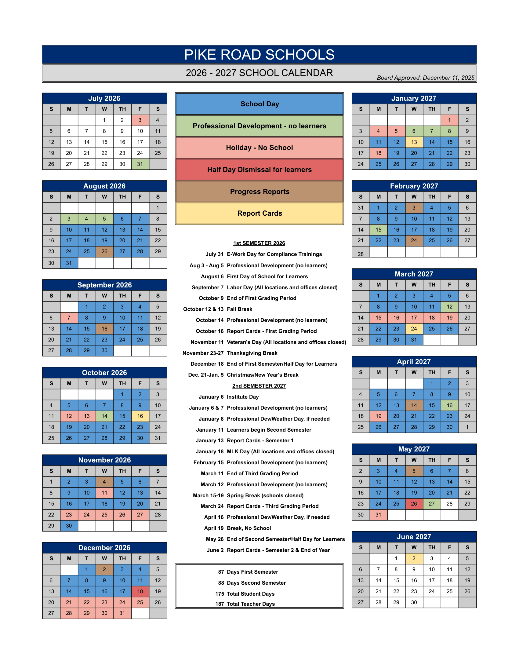 Dates are sourced from the official Pike Road Schools AL Calendar 26-27 Revised [PDF] website. Dates may change at the discretion of the district. Always verify with the official school website for the latest updates.