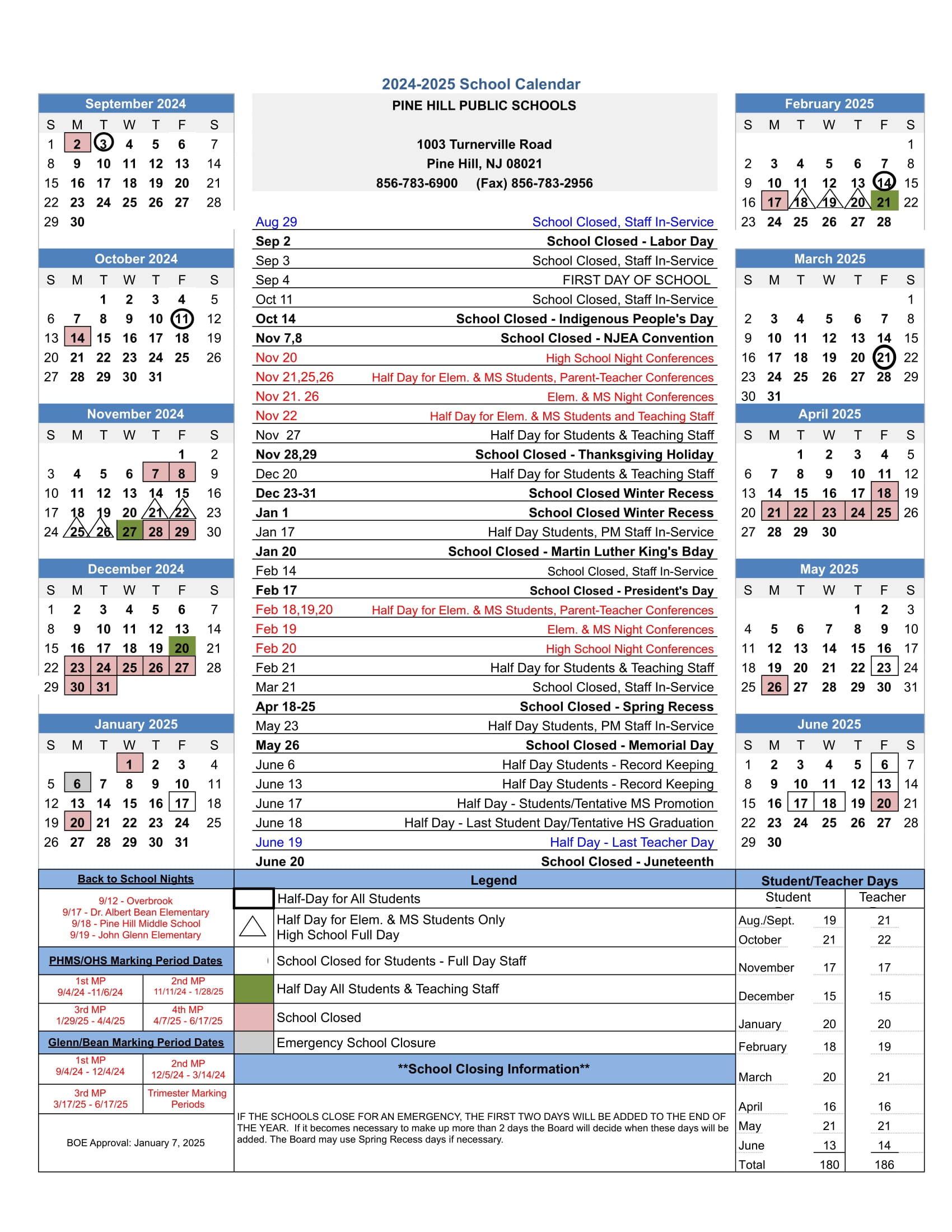 The printable school calendar provided on this page is taken from the official Pine hill Public Schools Calendar District website. Please note that all dates and events are subject to change at the discretion of the school district. For the most accurate and updated information, please refer to the official district website or contact the school helpline.