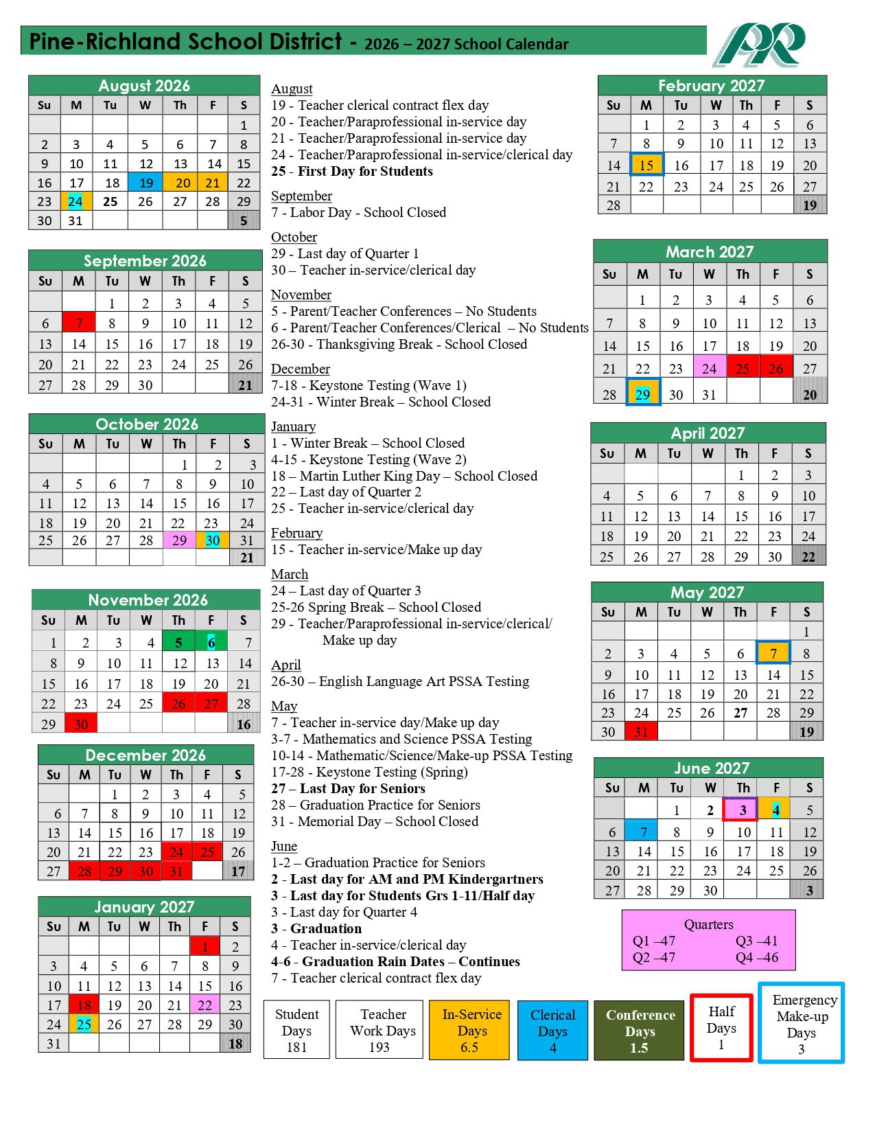 Dates are sourced from the official Pine-Richland School District PA District 26-27 Revised PDF website. Dates may change at the discretion of the district. Always verify with the official school website for the latest updates.