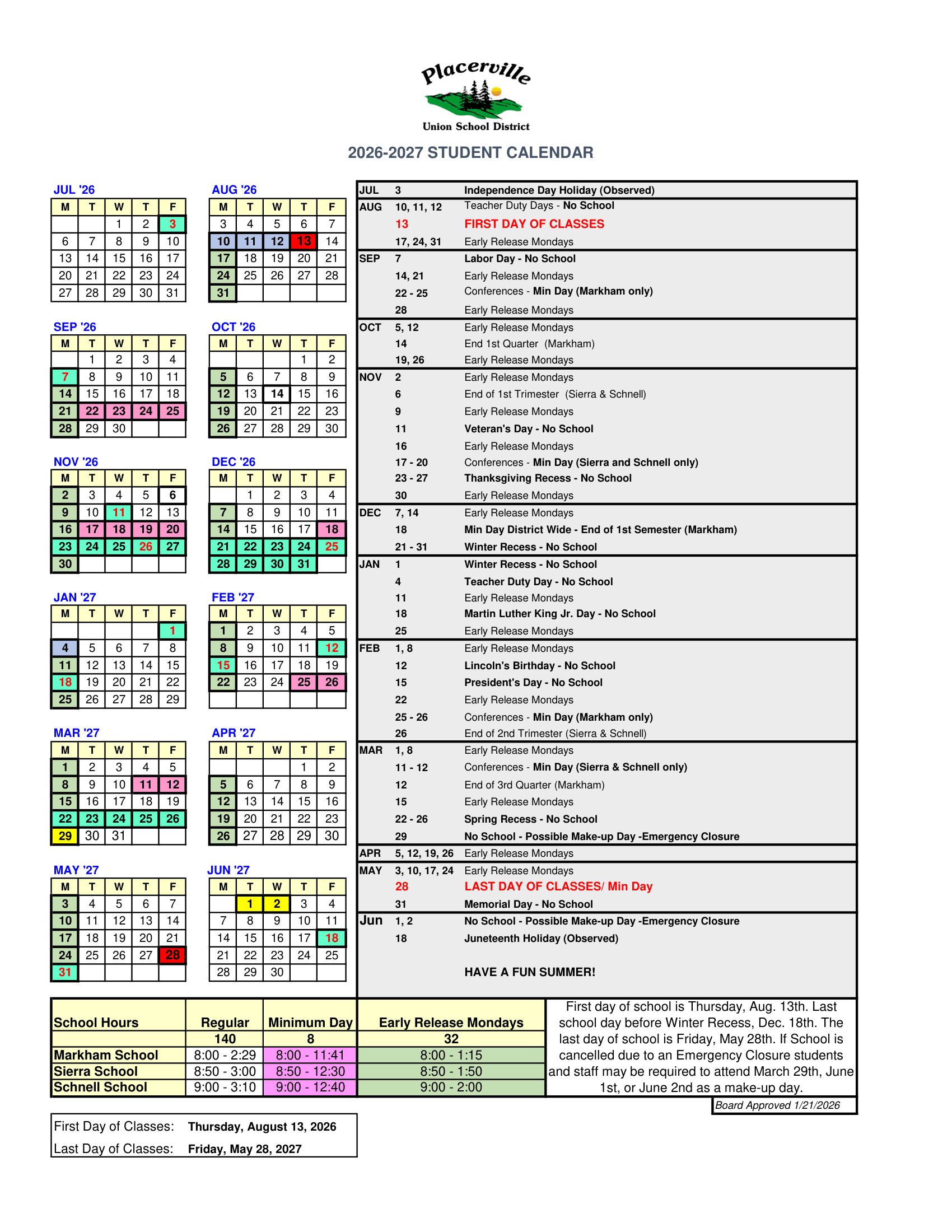 Dates are sourced from the official Placerville Union School District 26-27 Calendar Updated [PDF] website. Dates may change at the discretion of the district. Always verify with the official school website for the latest updates.
