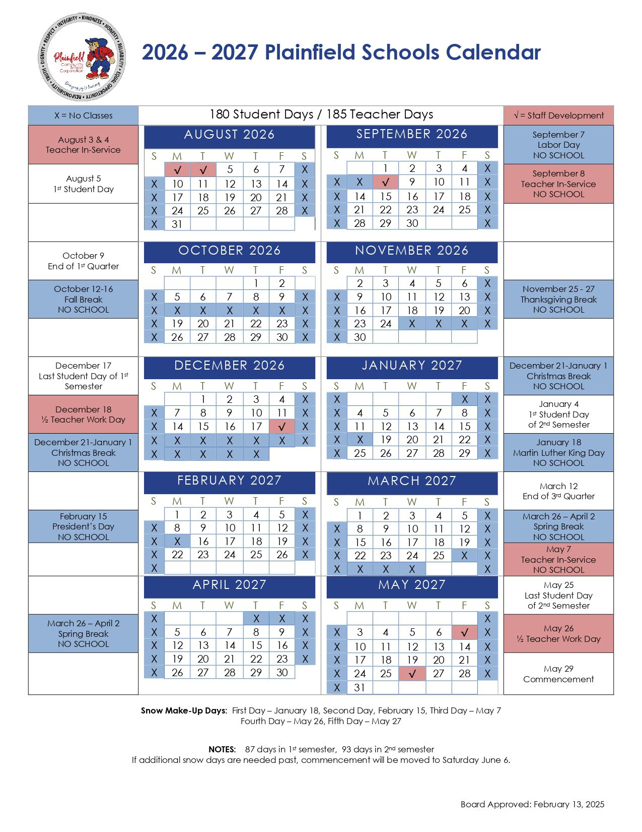 Dates are sourced from the official Plainfield Community School Calendar 26-27 [PDF] website. Dates may change at the discretion of the district. Always verify with the official school website for the latest updates.