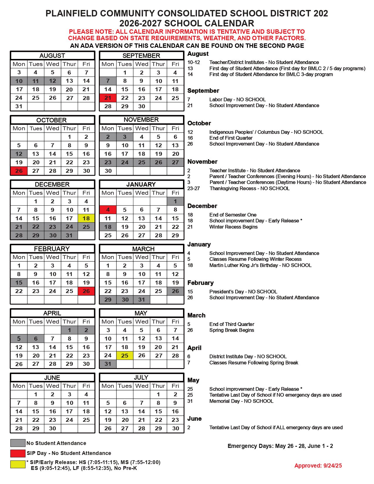 May 25, 2027School Improvement Day – Early Release / Tentative Last Day of School (No Emergency Days)