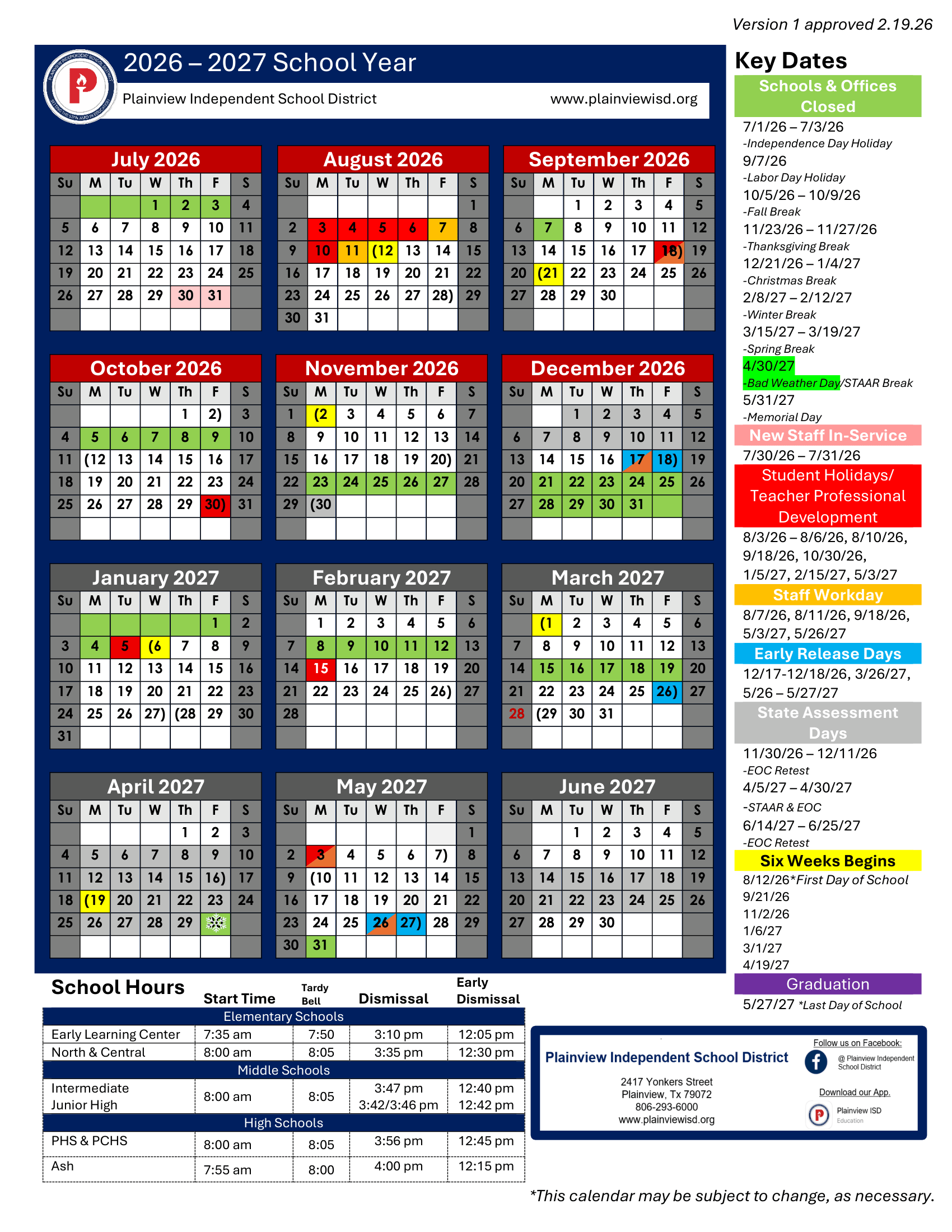 Dates are sourced from the official Plainview ISD Calendar 26-27 Revised [PDF] website. Dates may change at the discretion of the district. Always verify with the official school website for the latest updates.