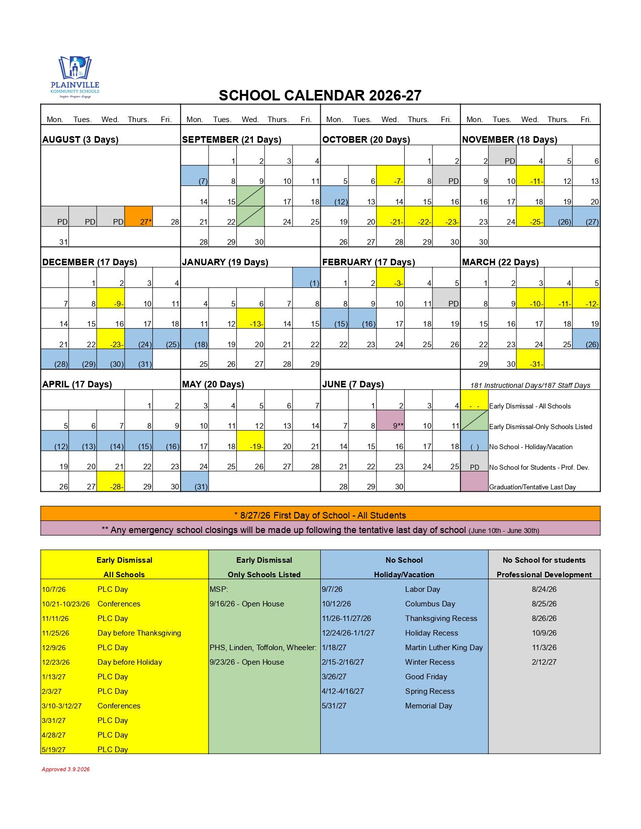 Plainville Community Schools Calendar (2026-2027)