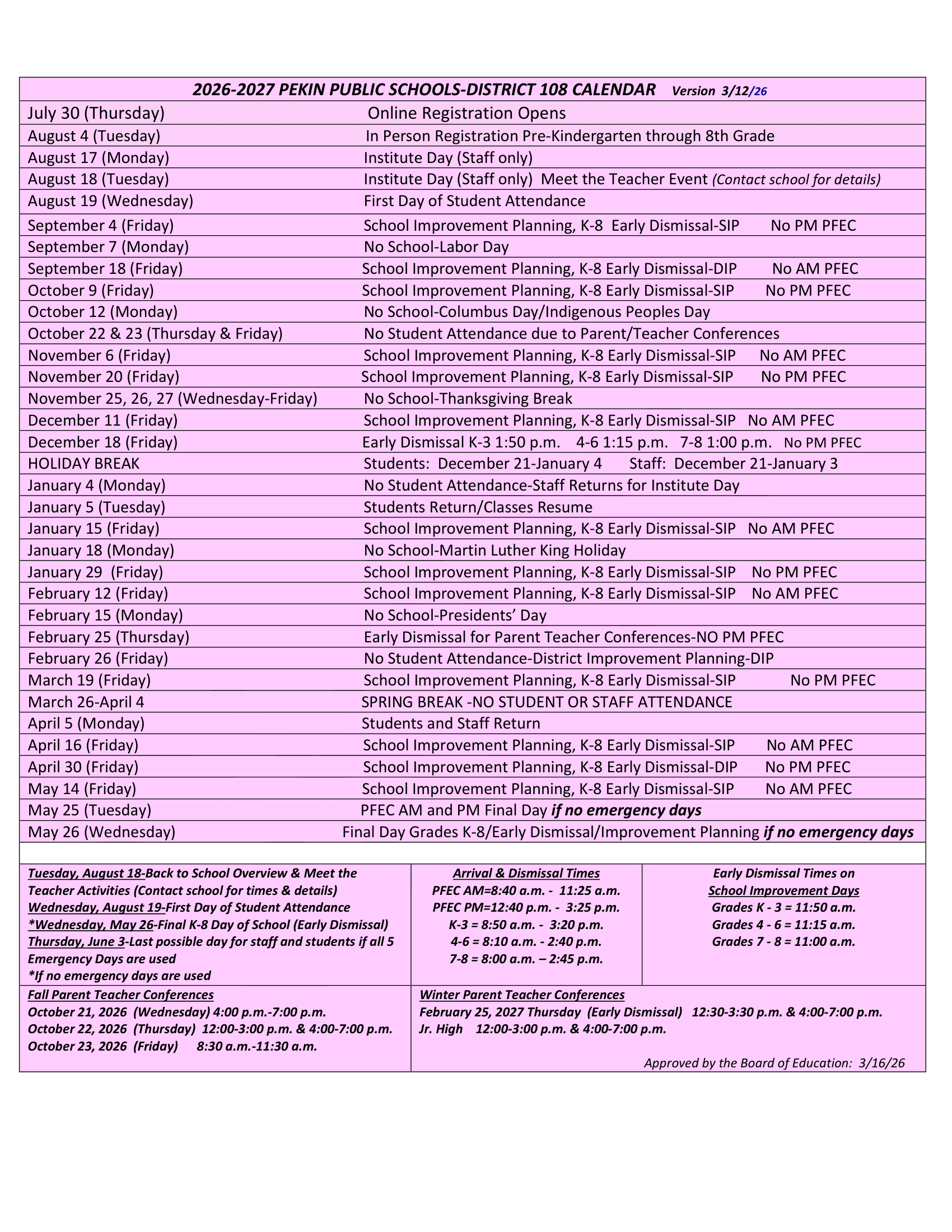 Oct 29, 2026Early Dismissal / Parent-Teacher Conferences