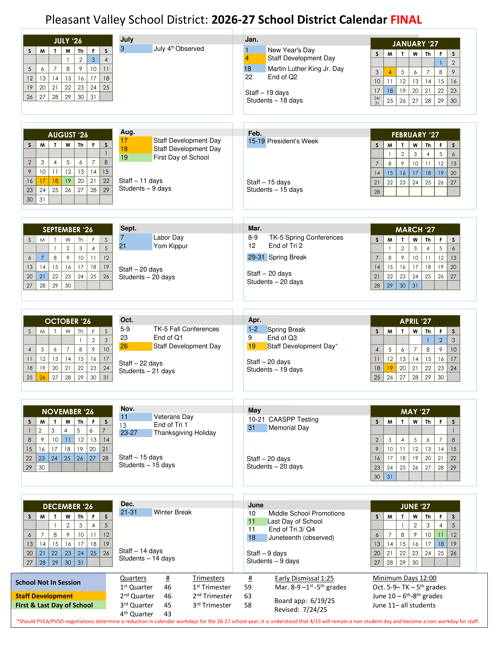 Dates are sourced from the official Pleasant Valley School District 26-27 Calendar [PDF] website. Dates may change at the discretion of the district. Always verify with the official school website for the latest updates.