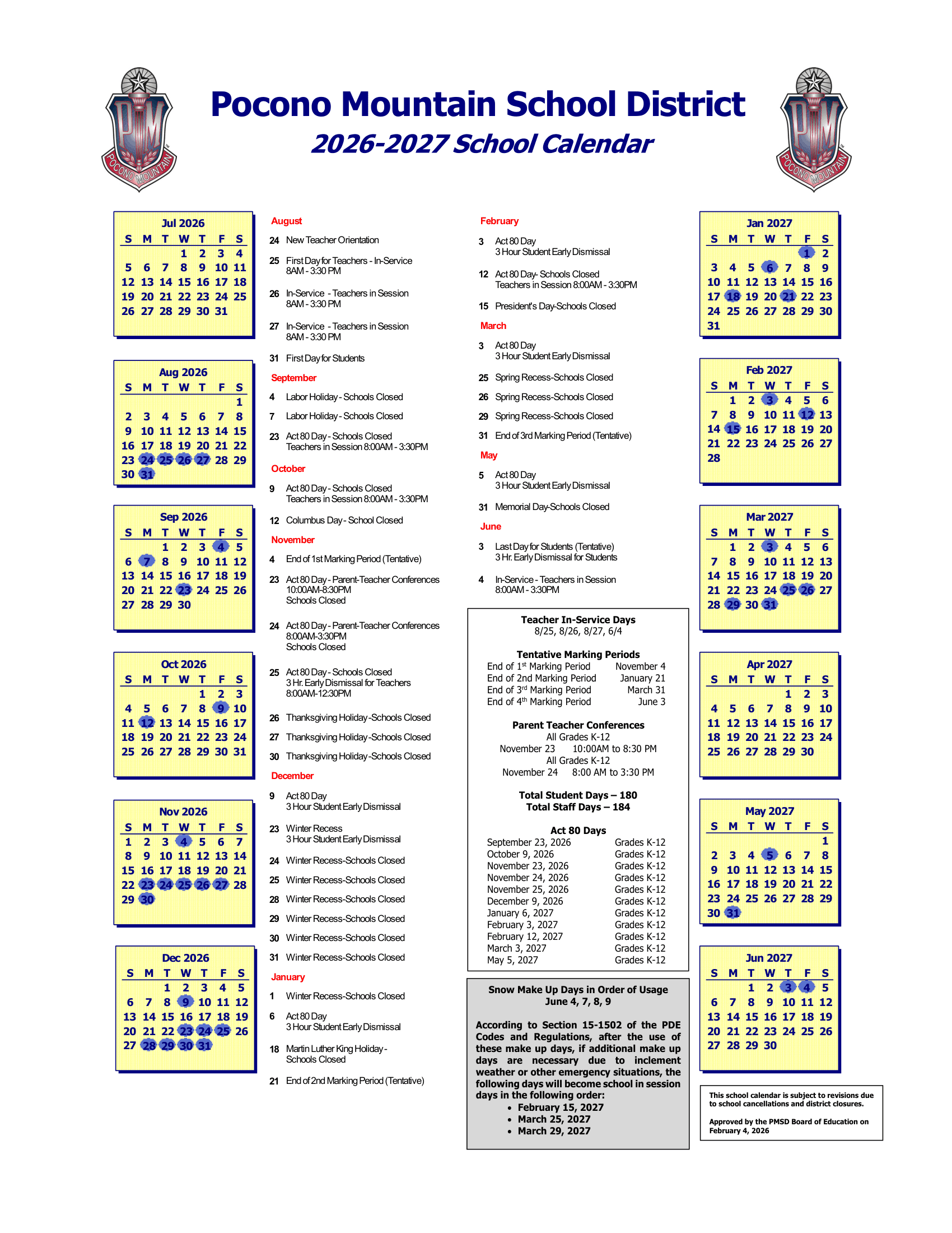 Dates are sourced from the official Pocono Mountain School District PA 26-27 Calendar Updated [PDF] website. Dates may change at the discretion of the district. Always verify with the official school website for the latest updates.