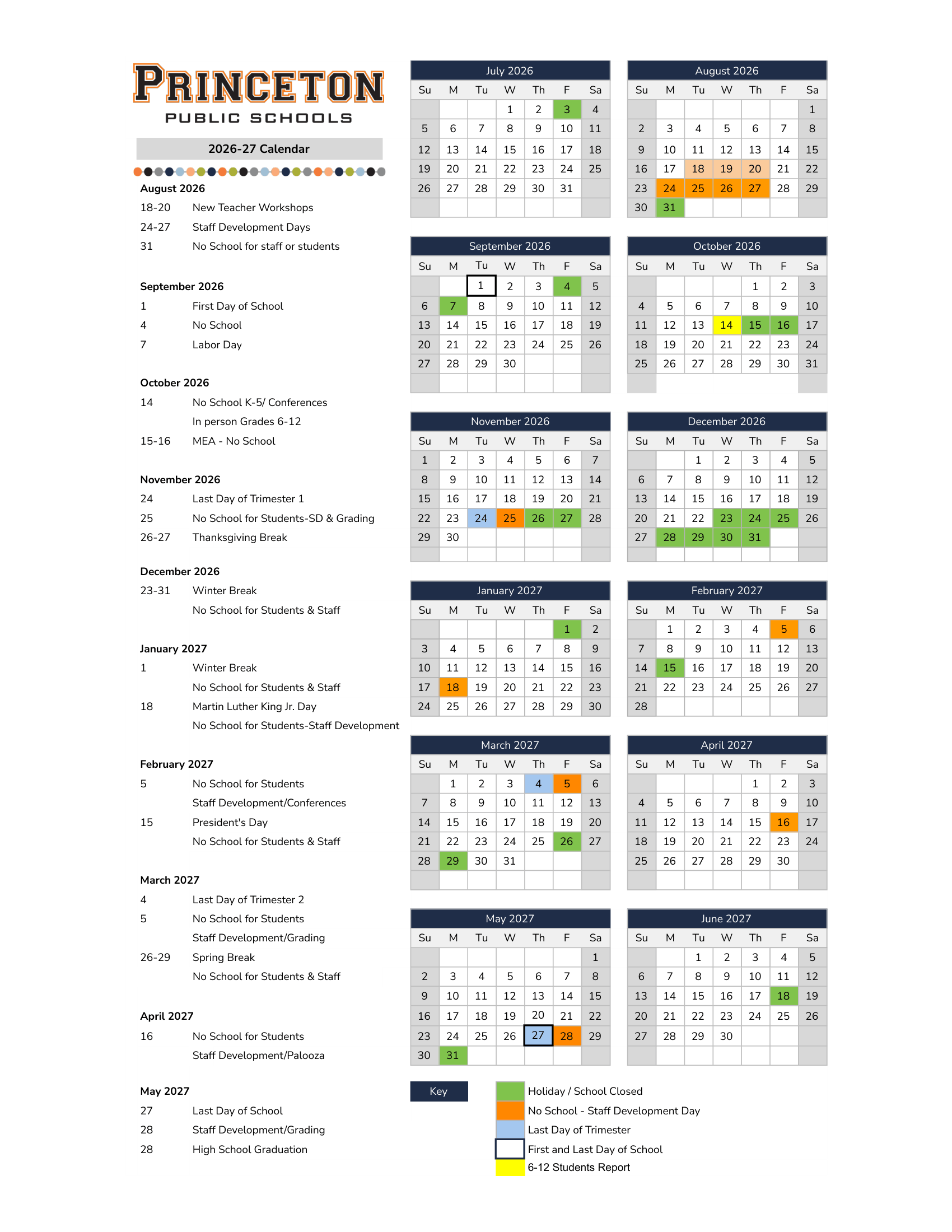 Dates are sourced from the official Princeton Public Schools 26-27 Calendar Revised [PDF] website. Dates may change at the discretion of the district. Always verify with the official school website for the latest updates.