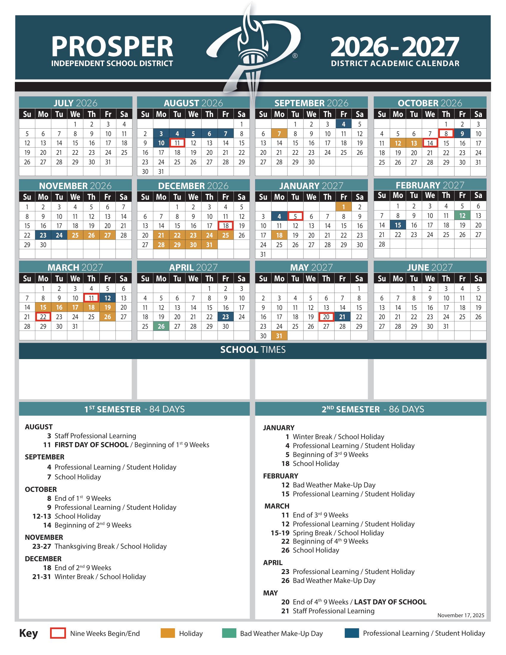 Dates are sourced from the official Prosper ISD Calendar 26-27 Calendars [PDF] website. Dates may change at the discretion of the district. Always verify with the official school website for the latest updates.
