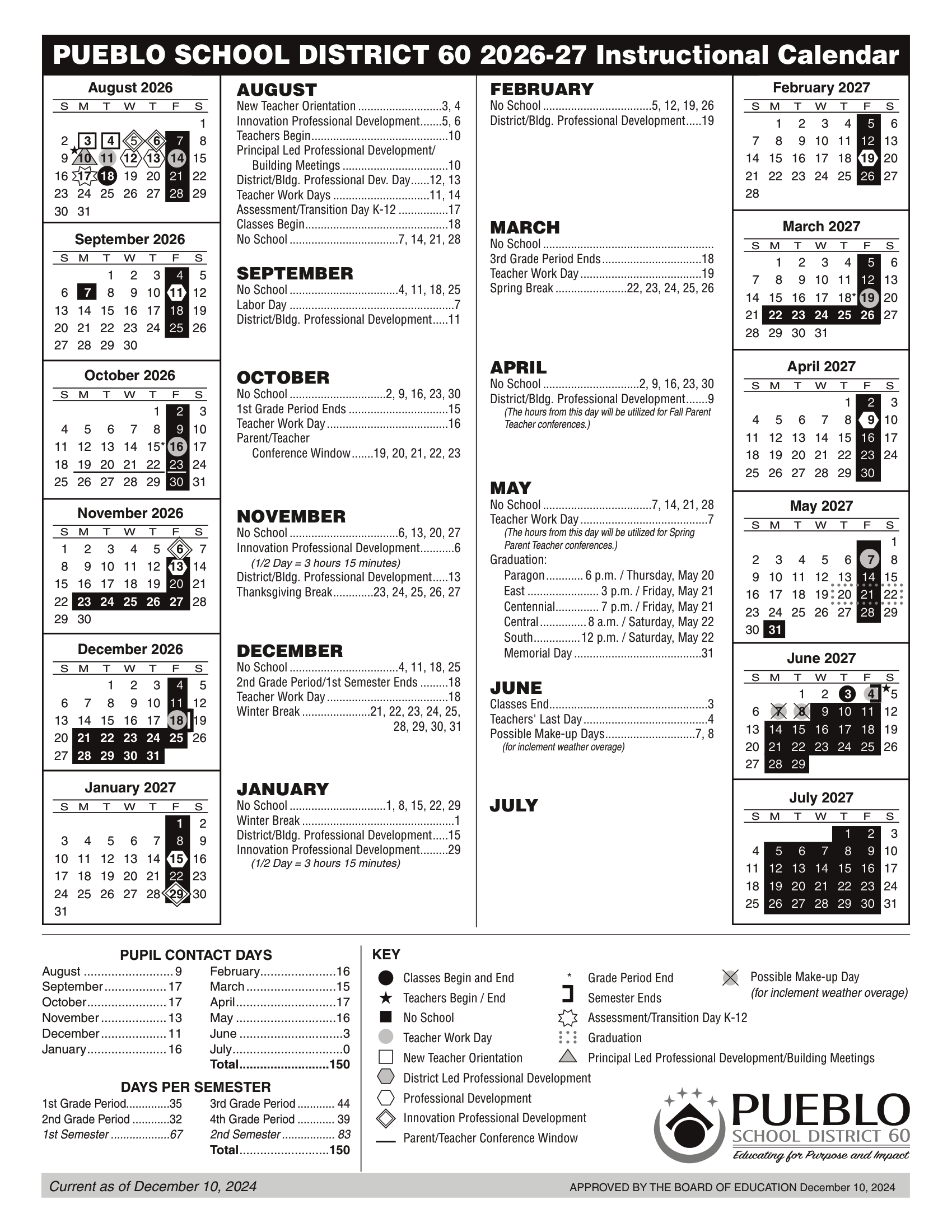 Dates are sourced from the official Pueblo School District 60 26-27 Calendar Updates website. Dates may change at the discretion of the district. Always verify with the official school website for the latest updates.
