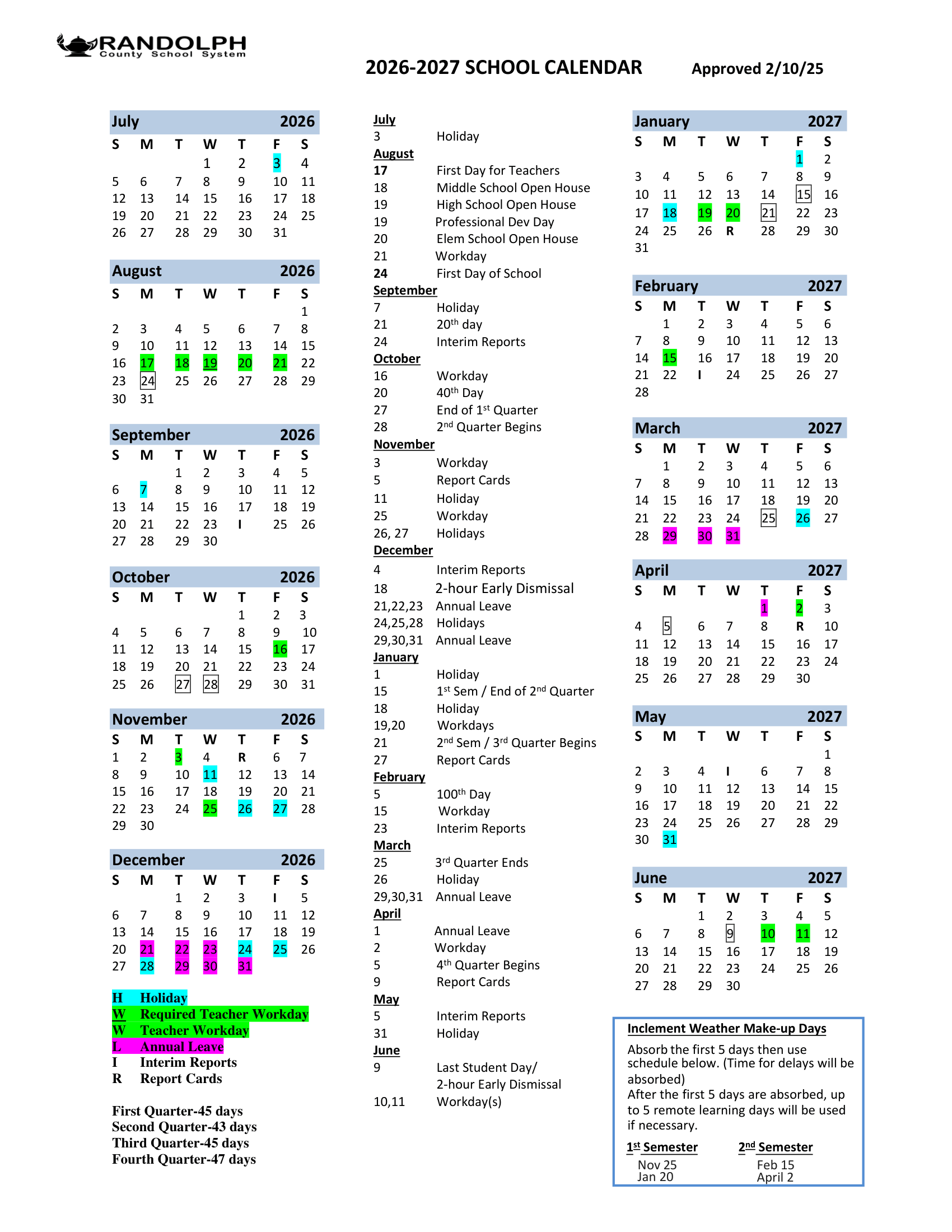 Dates are sourced from the official Randolph County School System 26-27 Calendar Revised [pdf] website. Dates may change at the discretion of the district. Always verify with the official school website for the latest updates.