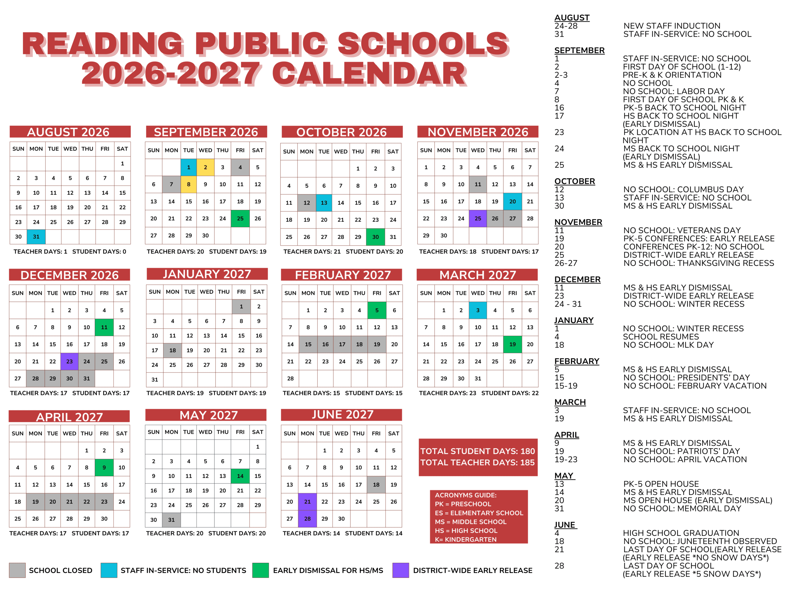 Dates are sourced from the official Reading Public Schools MA Calendar 26-27 Revised [PDF] website. Dates may change at the discretion of the district. Always verify with the official school website for the latest updates.