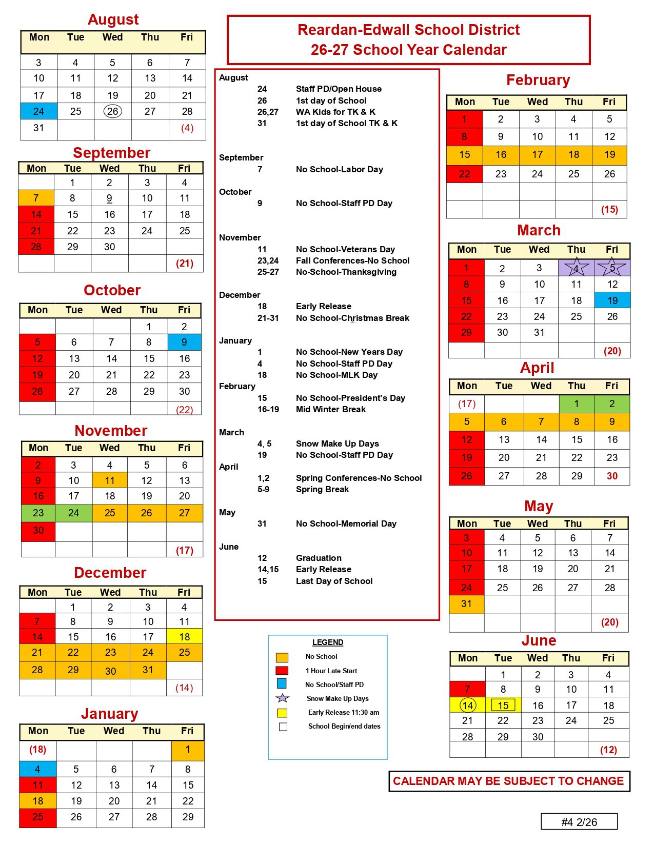 The Printable school calendar provided on this page is taken from the official Reardan-Edwall School District WA Calendar 26/27 Updated. Please note that all dates and events are subject to change at the discretion of the school district. For the most accurate and updated information, please refer to the official district website or contact the school helpline.