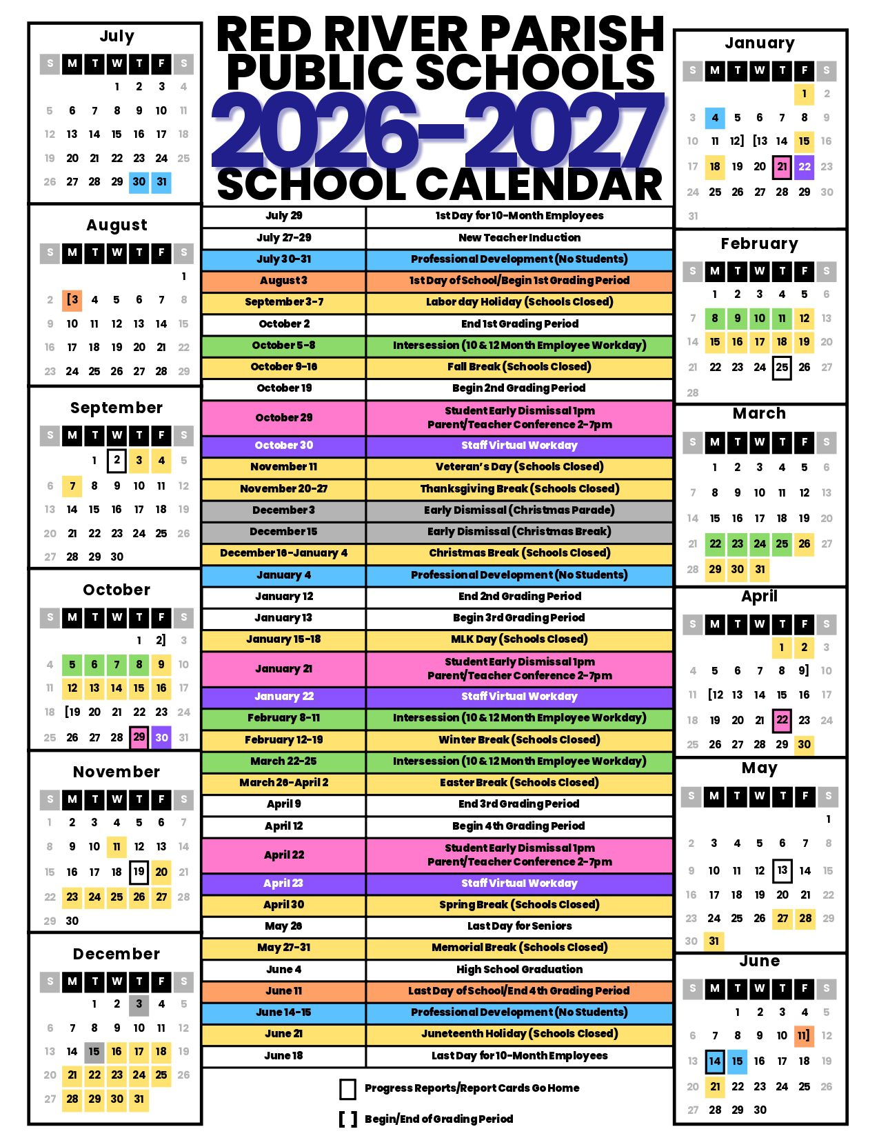 Dates are sourced from the official RED RIVER PARISH PUBLIC SCHOOLS Calendar 26-27 Revised [PDF] website. Dates may change at the discretion of the district. Always verify with the official school website for the latest updates.