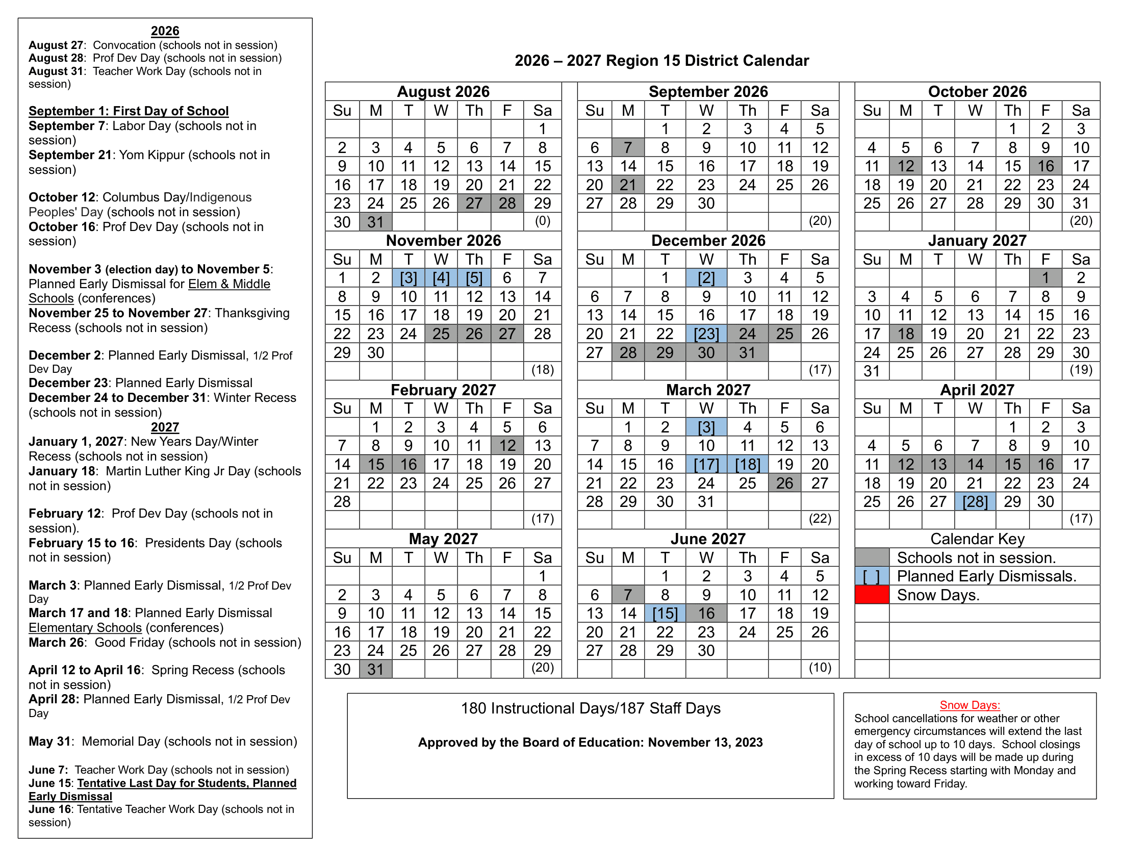 Region 15 District Calendar (2026-2027)