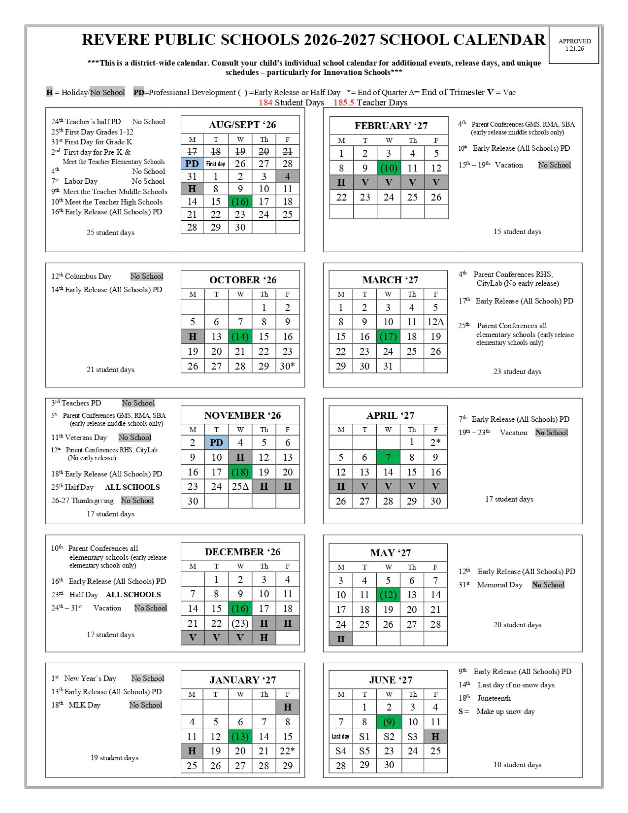 Dates are sourced from the official REVERE PUBLIC SCHOOLS Calendar 26-27 [PDF] website. Dates may change at the discretion of the district. Always verify with the official school website for the latest updates.