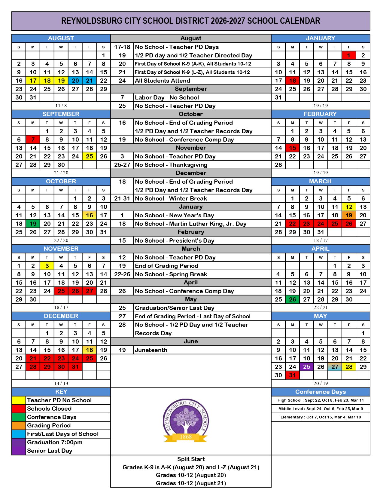 Dates are sourced from the official Reynoldsburg City School District OH Calendar 26-27 Updates website. Dates may change at the discretion of the district. Always verify with the official school website for the latest updates.