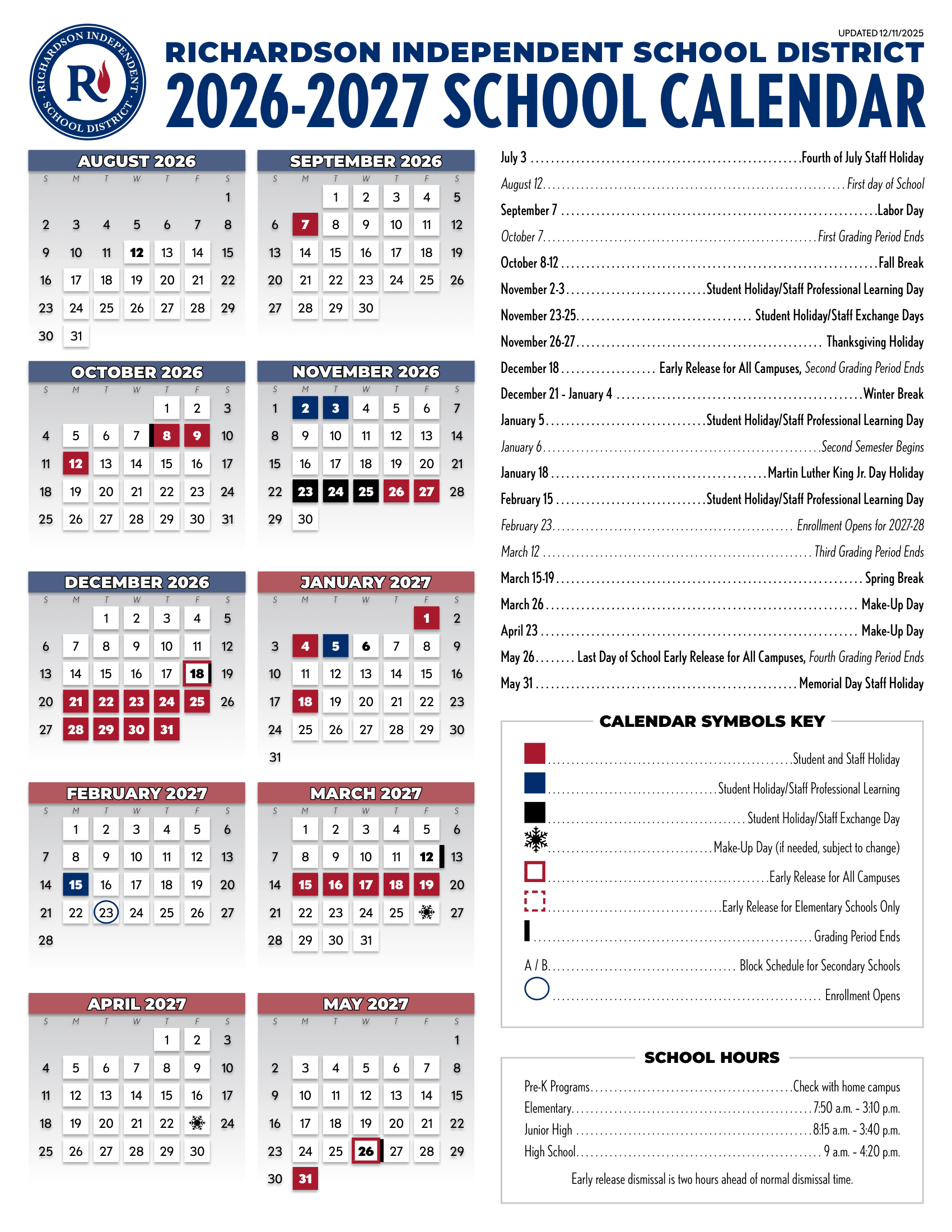 The Printable school calendar provided on this page is taken from the official Richardson ISD Independent School District Calendar 26-27. Please note that all dates and events are subject to change at the discretion of the school district. For the most accurate and updated information, please refer to the official district website or contact the school helpline.