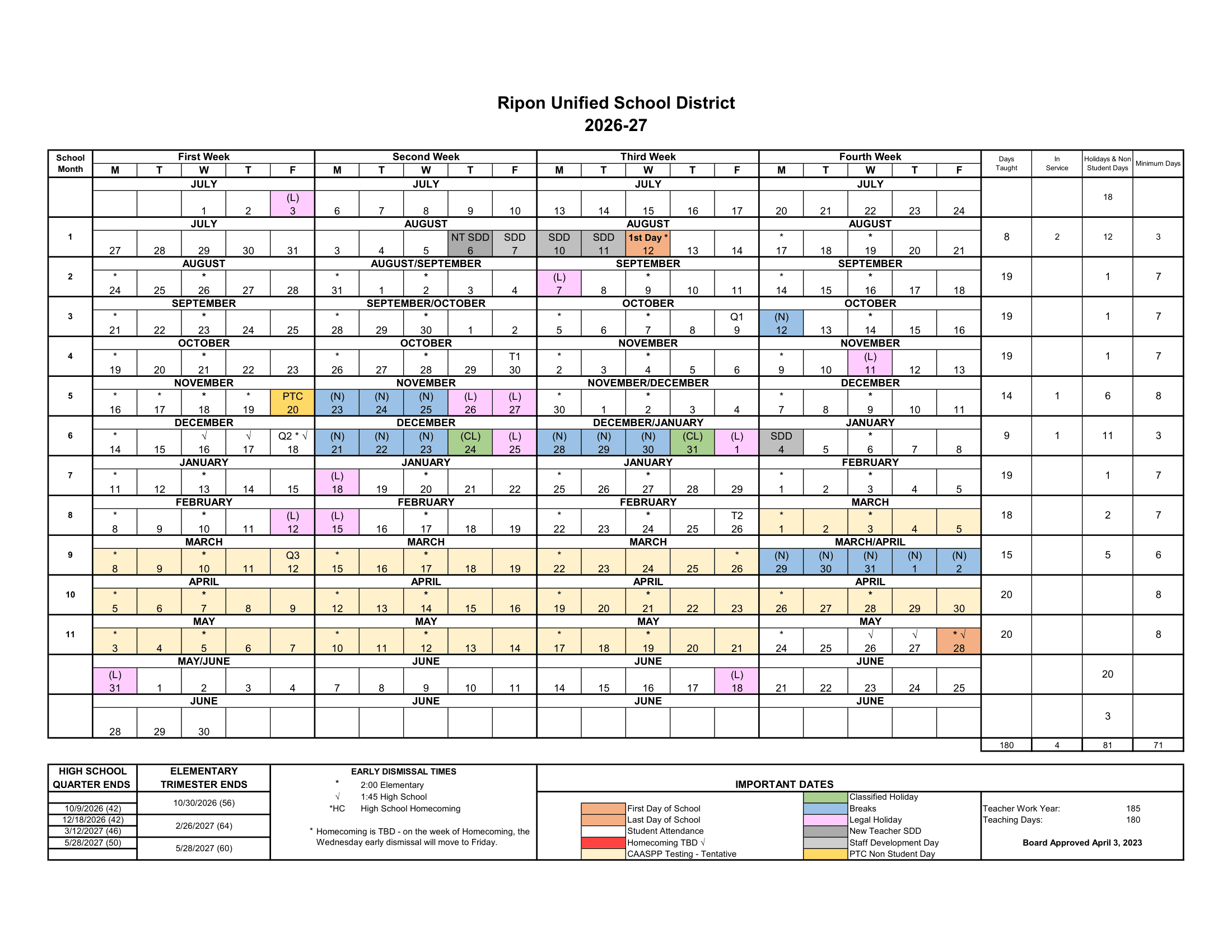 Ripon Unified School District Calendar (2026-2027)