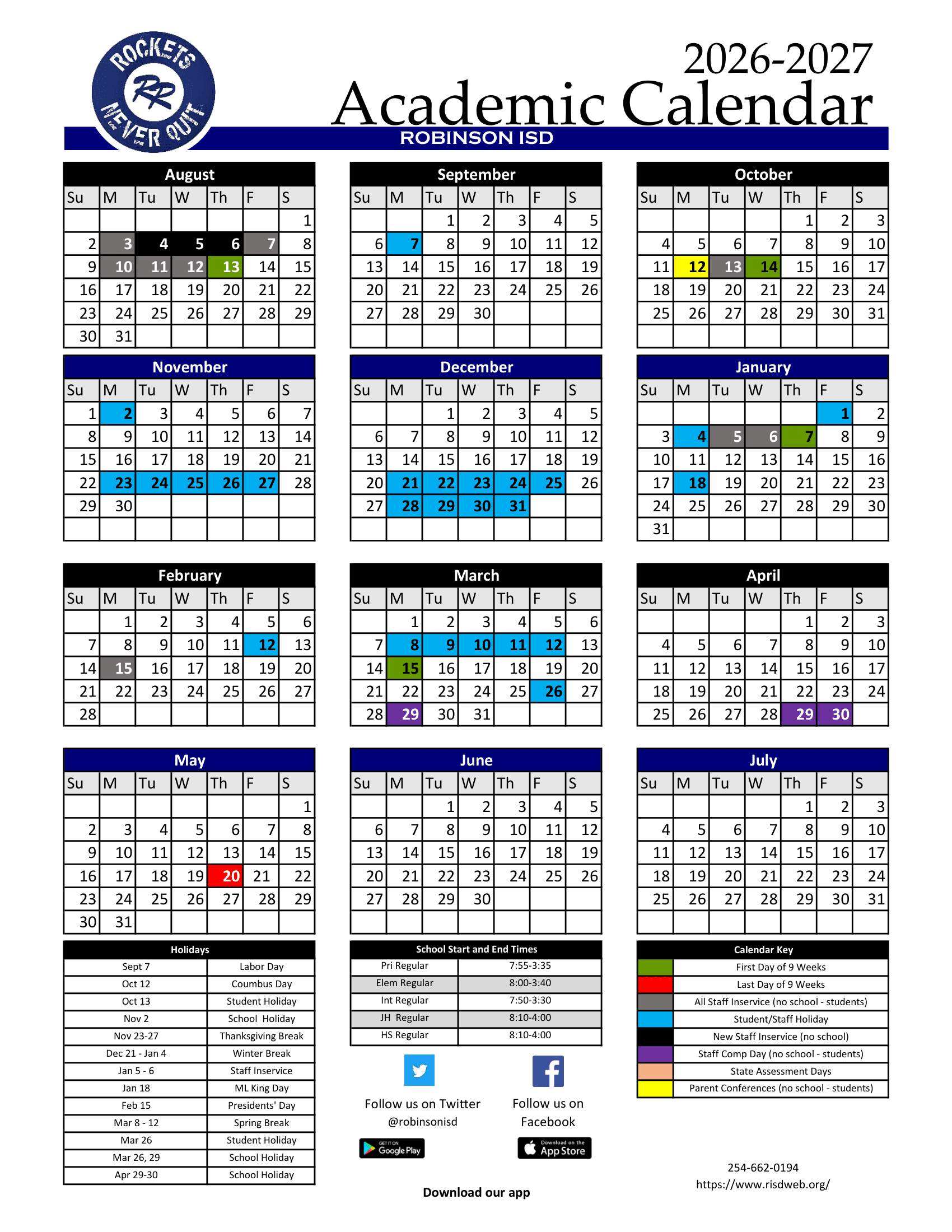 Dates are sourced from the official Robinson ISD calendar 26-27 Revised [PDF] website. Dates may change at the discretion of the district. Always verify with the official school website for the latest updates.