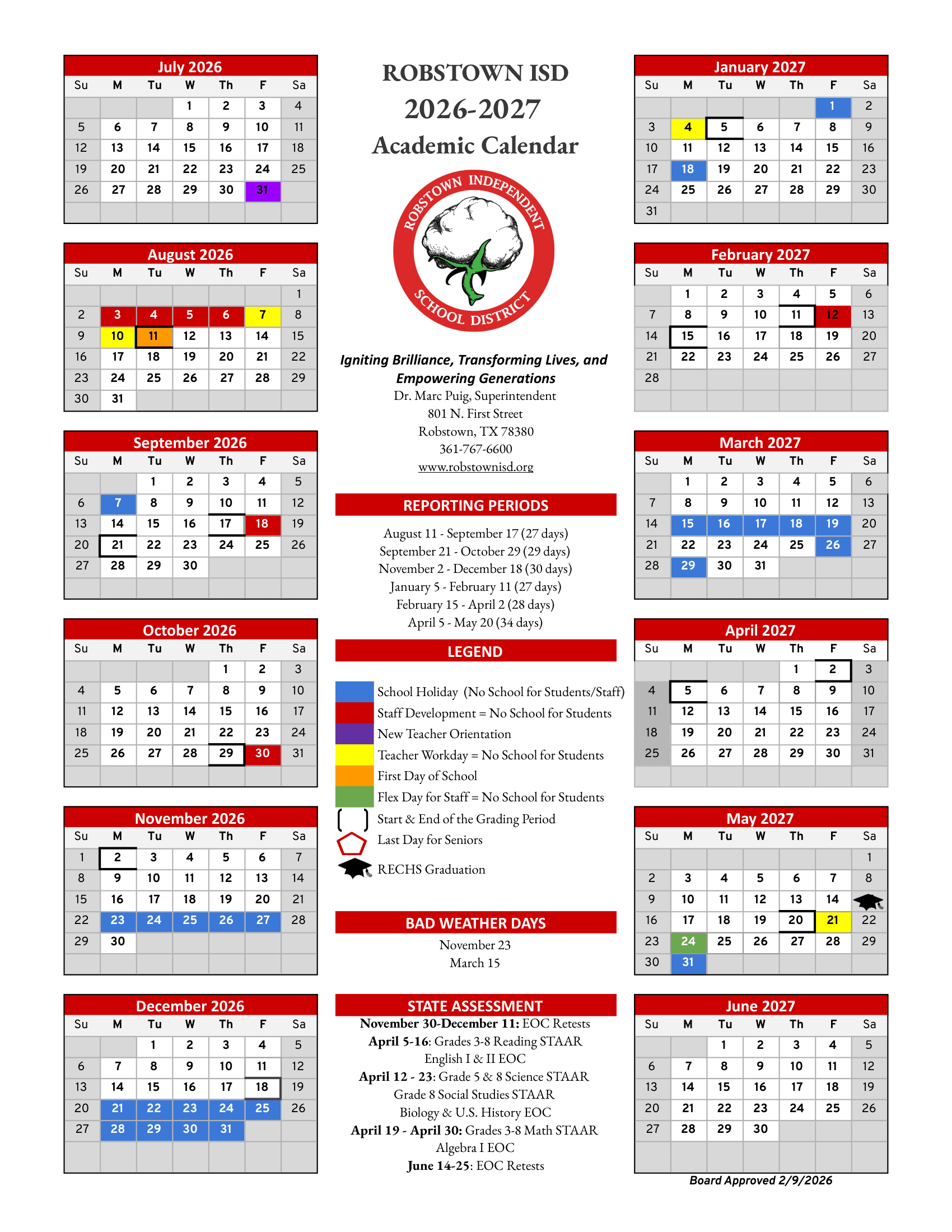 Robstown Independent School District Calendar (2026-2027)