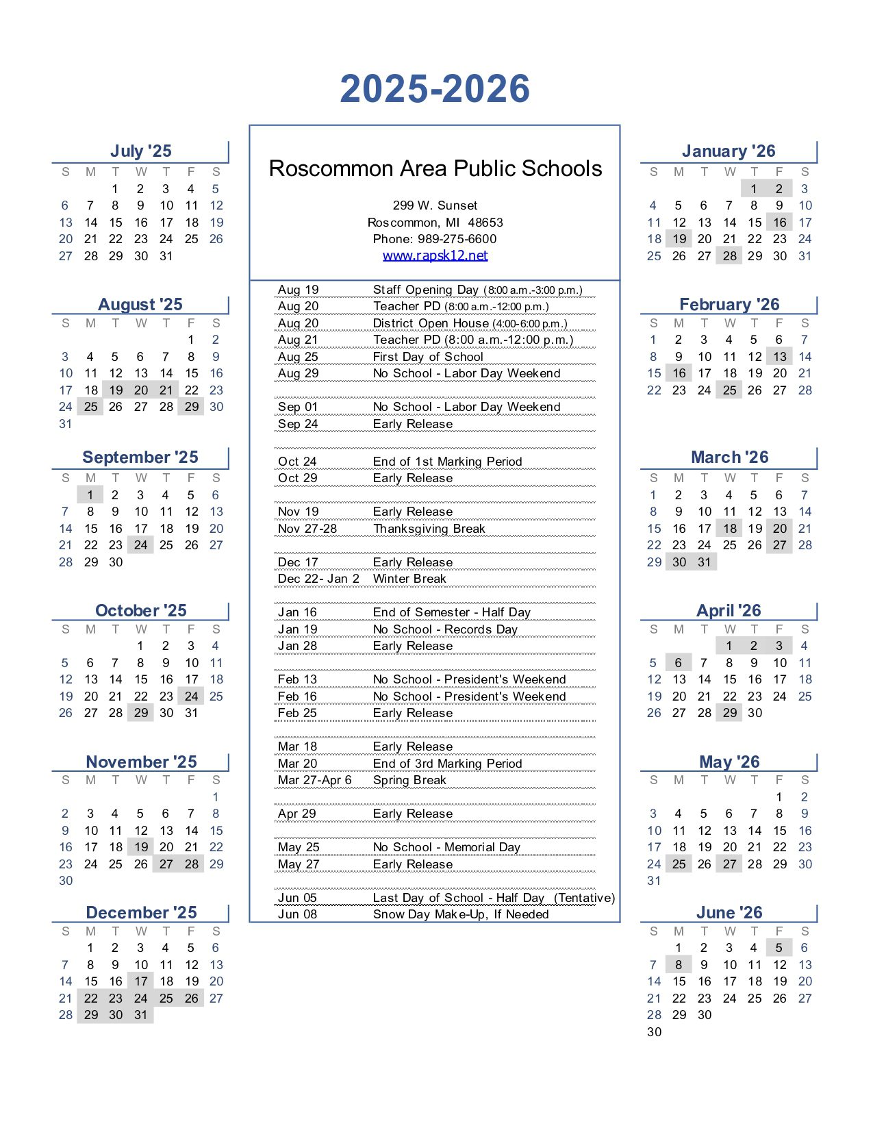 Roscommon Area Public Schools Calendar (2025-2026)