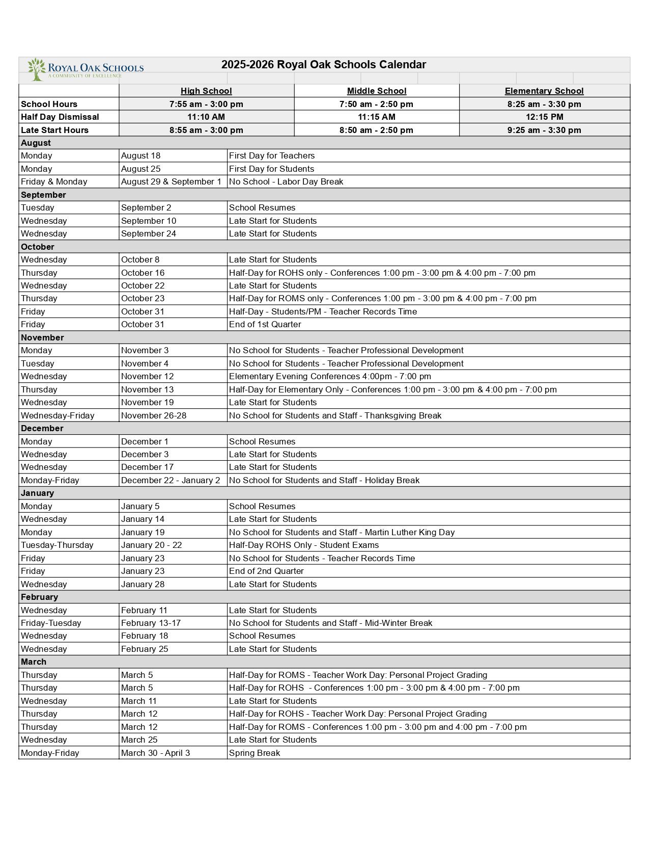 The school calendar provided on this page is taken from the official Royal Oak Schools MI Calendar Michigan School District website. Please note that all dates and events are subject to change at the discretion of the school district. For the most accurate and updated information, please refer to the official district website or contact the school helpline.