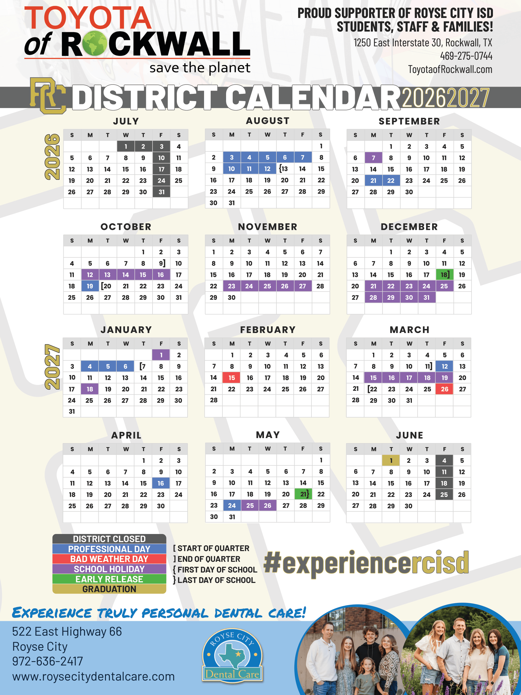 Dates are sourced from the official Royse City ISD 26-27 Calendar Revised [PDF] website. Dates may change at the discretion of the district. Always verify with the official school website for the latest updates.