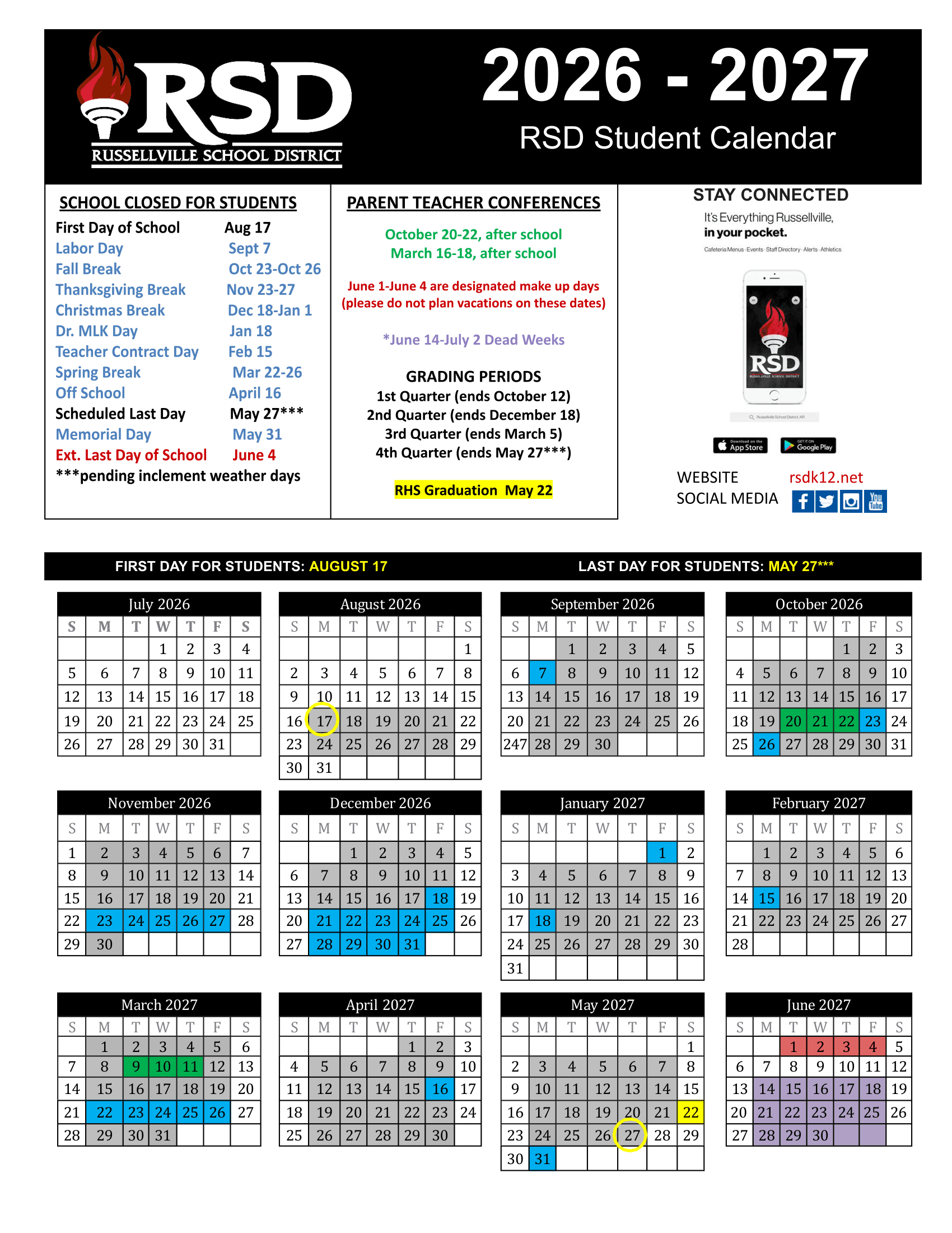 Dates are sourced from the official Russellville School District 26-27 Calendar Updated [PDF] website. Dates may change at the discretion of the district. Always verify with the official school website for the latest updates.