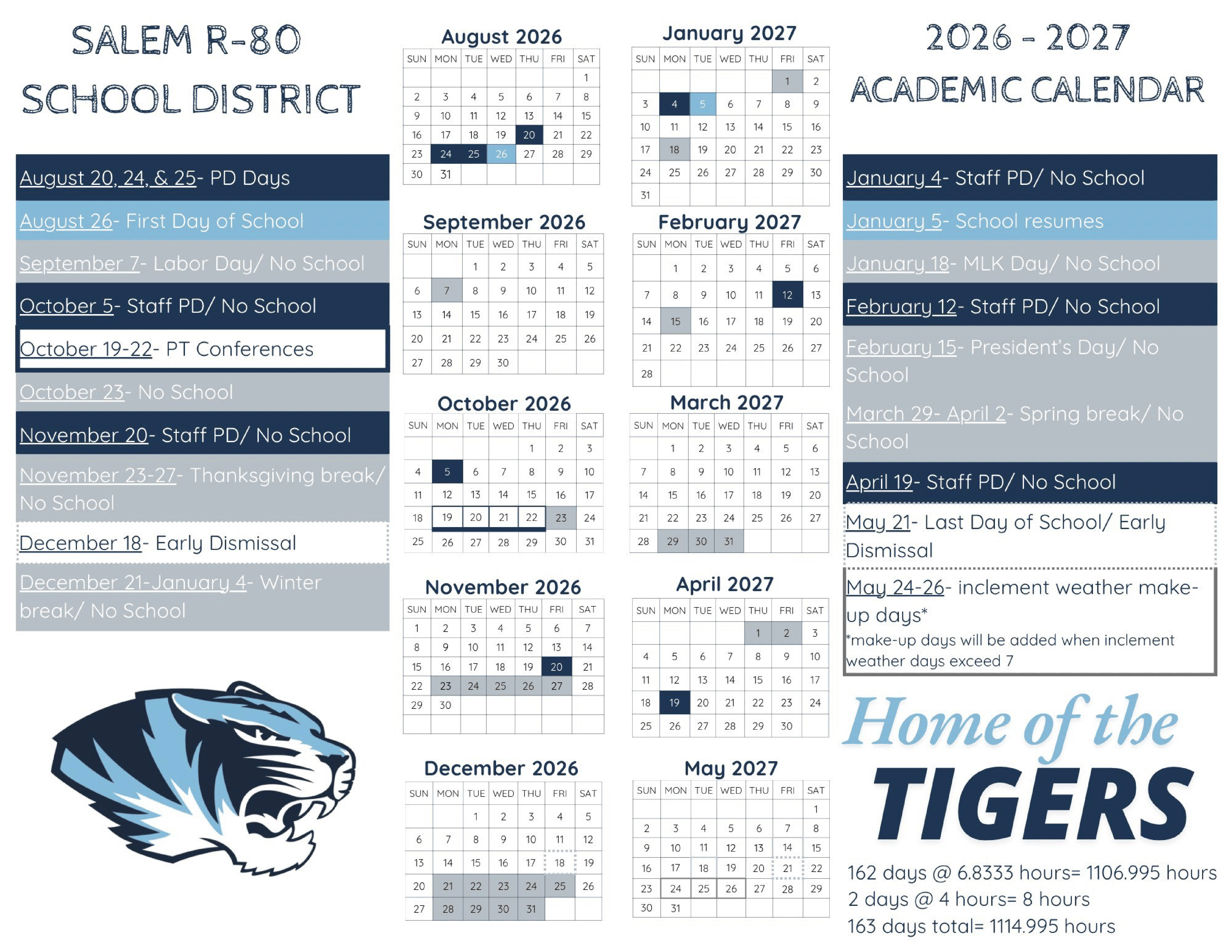 The Printable school calendar provided on this page is taken from the official Salem R-80 School Calendar 26-27 Updates. Please note that all dates and events are subject to change at the discretion of the school district. For the most accurate and updated information, please refer to the official district website or contact the school helpline.