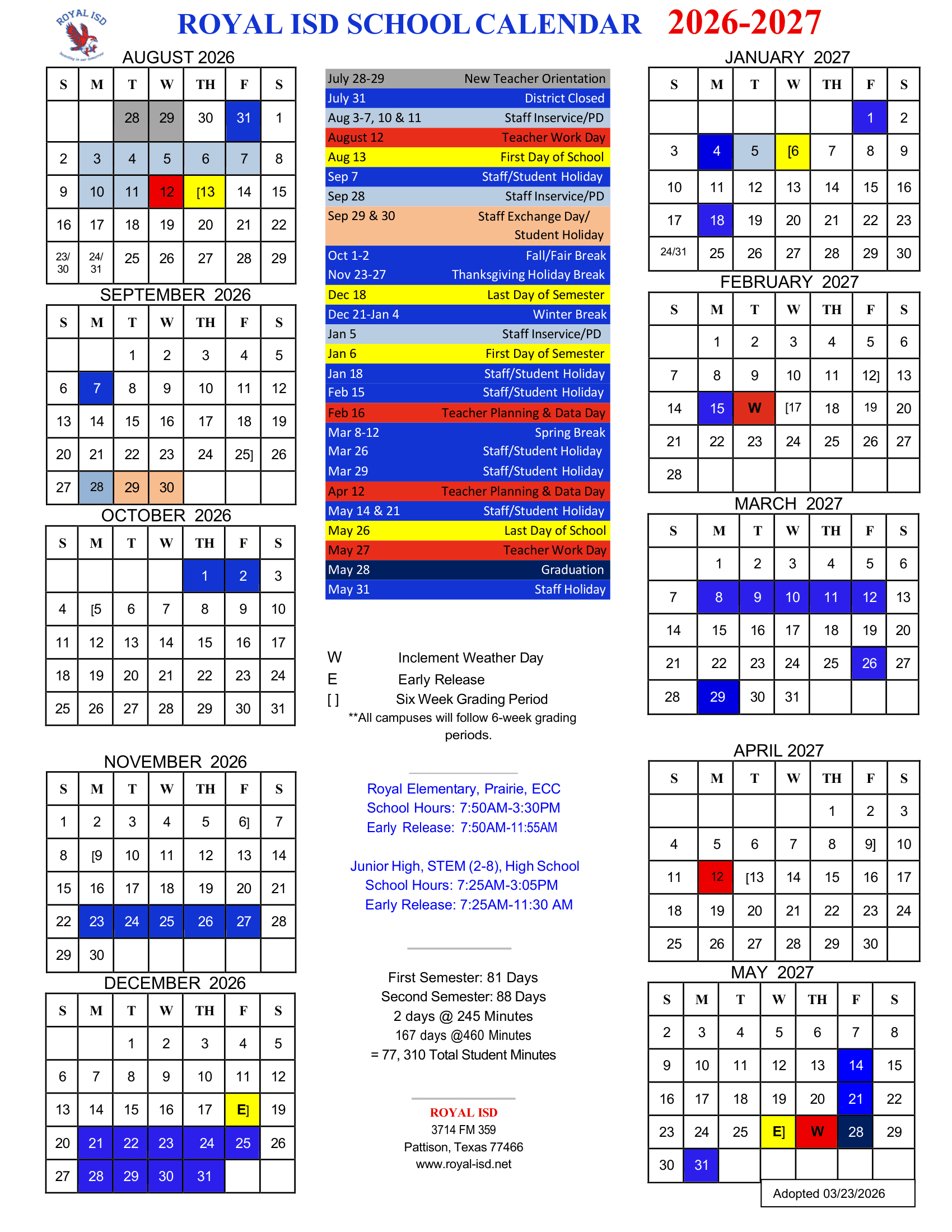 Official School Calendar for Academic Year 2026–2027