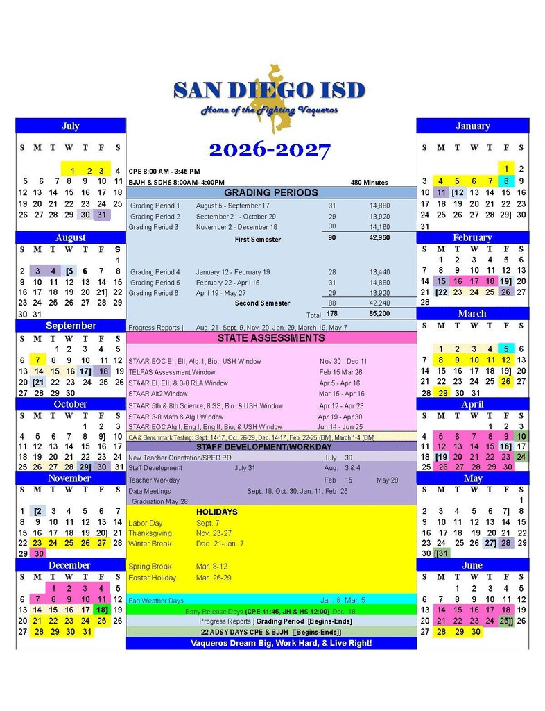 Dates are sourced from the official San Diego ISD 26-27 Calendar Revised [PDF] website. Dates may change at the discretion of the district. Always verify with the official school website for the latest updates.