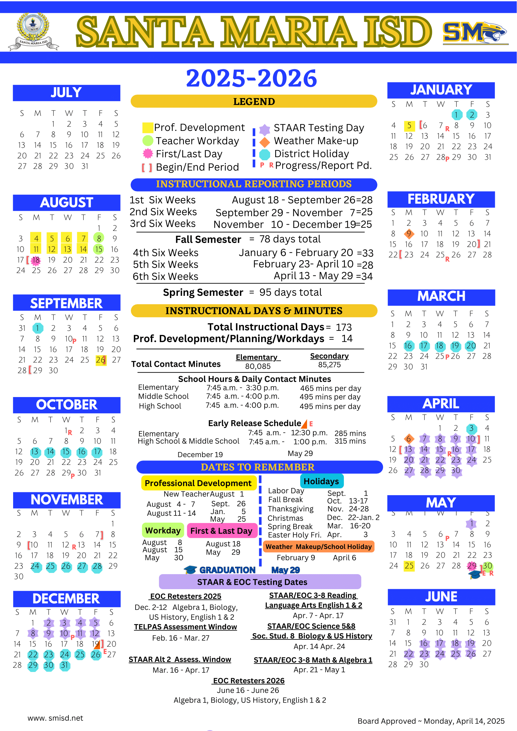 The school calendar provided on this page is taken from the official SANTA MARIA ISD Calendar website. Please note that all dates and events are subject to change at the discretion of the school district. For the most accurate and updated information, please refer to the official district website or contact the school helpline.